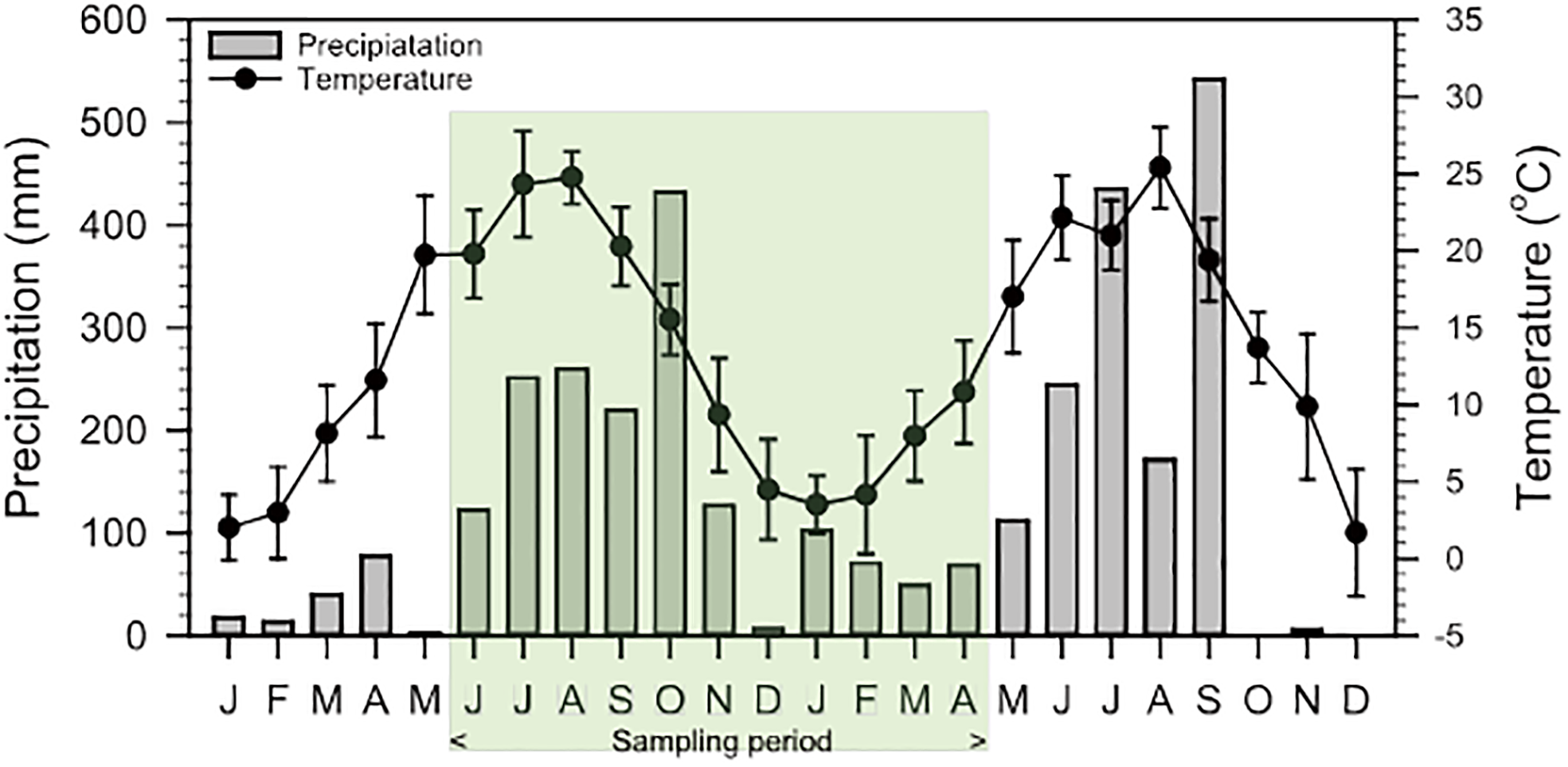 Monthly precipitation and average of atmospheric temperature variations from January 2019 to December 2020 in Gangneung city. Green box represents sampling period.