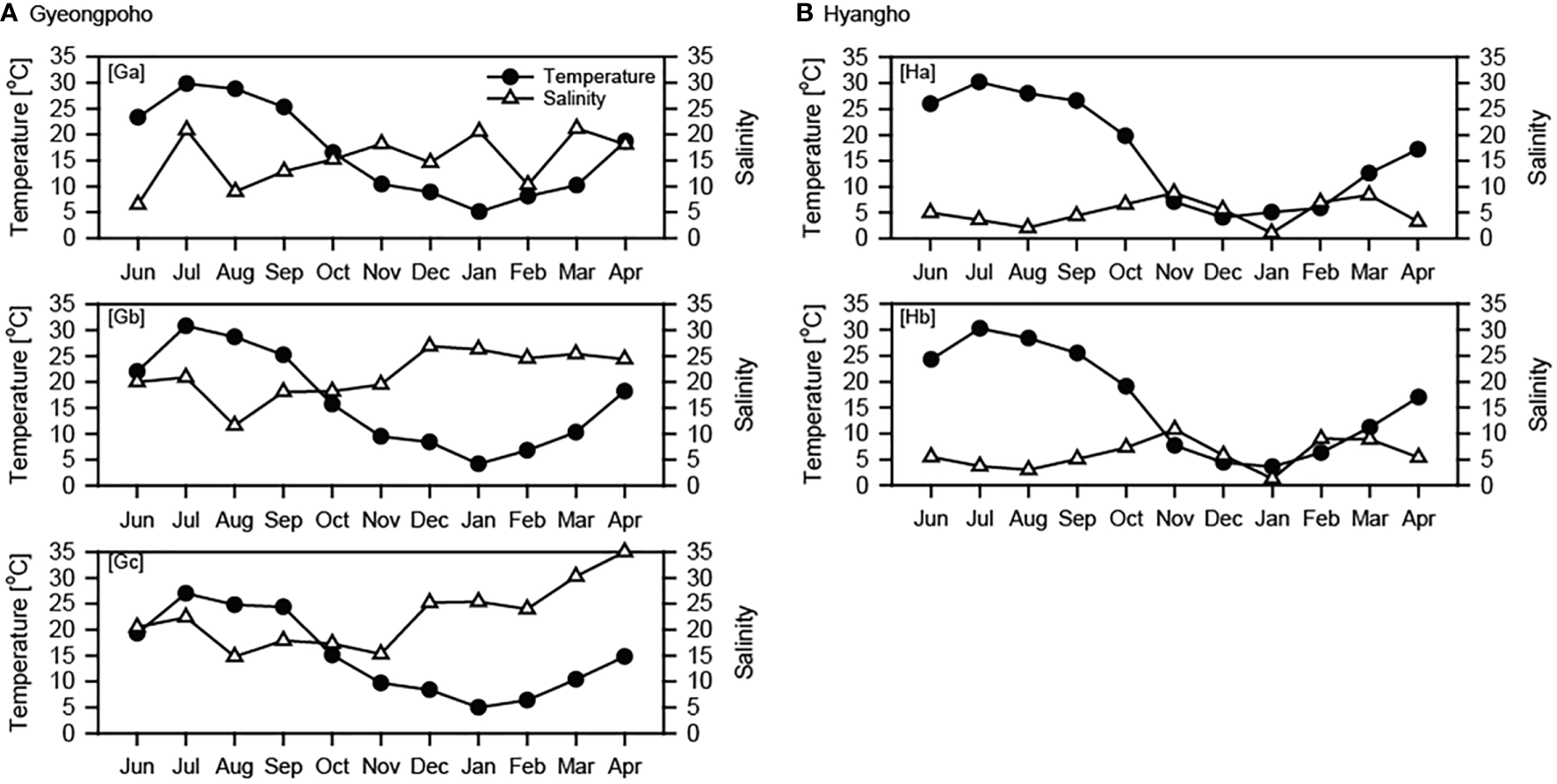 Monthly variations in water temperature and salinity at study sites in Gyeongpoho (A) and Hyangho (B) during sampling period.