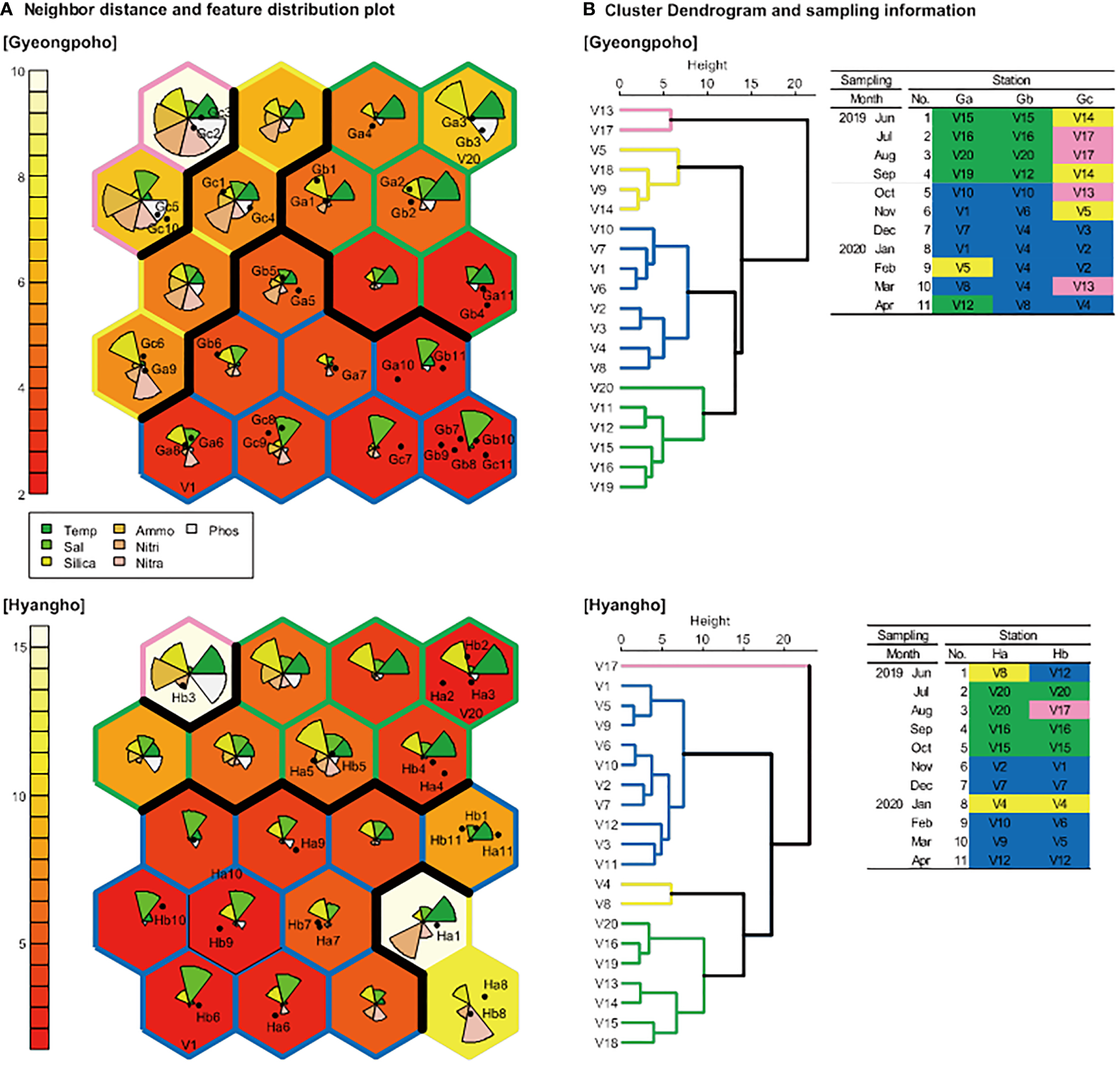 SOM training results were condensed onto 4×5 rectangular grid maps based on 33 datasets (three stations over 11 months) and 22 datasets (two stations over 11 months) of seven physicochemical variables in Gyeongpoho and Hyangho, respectively (Figure 6). In both lagoons, the dendrograms of SOM results grouped major 2 cluster coinciding with monsoon and non-monsoon periods, reflecting temperature and salinity variations and minor 2 clusters with high nutrient concentrations.