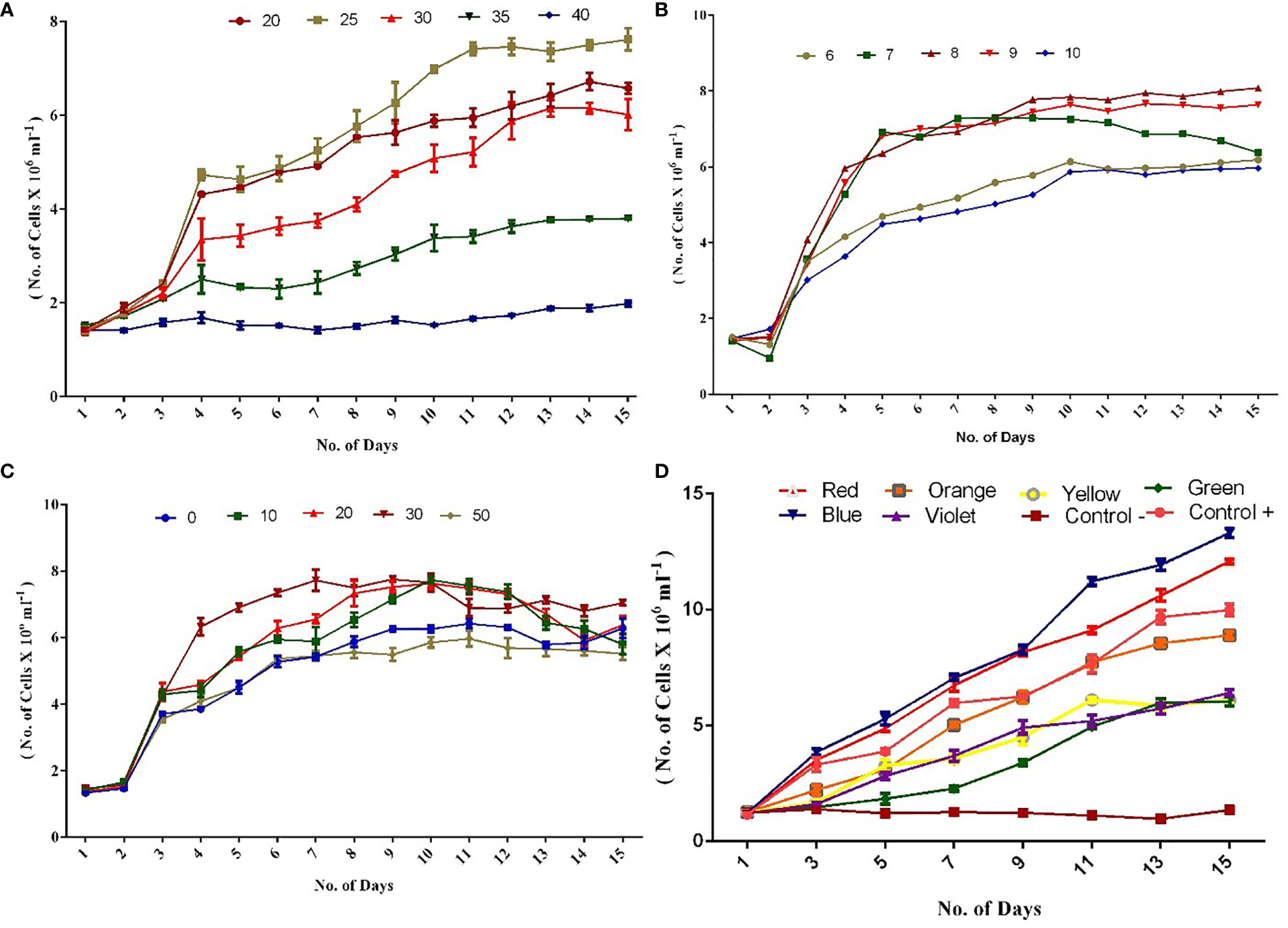 The effects of physicochemical parameters like temperature, pH, and salinity were examined to identify the optimal growth conditions for C. vulgaris. Different temperatures like 20°C, 25°C, 30°C, 35°C, and 40°C were attempted in this experiment using separately controlled incubators (Scigenics Biotech, Orbitek) fitted with fluorescent lamps (42 µmol m−2 s−1). Similarly, studies were conducted at different pH, viz., 6, 7, 8, 9, and 10. The pH of the culture medium was measured using a pH meter (Metrohm), and the pH level was adjusted using NaOH and HCl to raise or lower the value. In another set of experiments, the effect of salinity on the growth rate was carried out at different salinities (0, 10, 20, 30, and 50 Practical Salinity Unit (PSU)). Salinity was determined using a refractometer (Atago, Japan), and the culture medium was adjusted with distilled water or NaCl to either reduce and/or increase the salinity. Experiments on different light intensities was carried out under phototrophic conditions using fluorescent lamp (Philips 23W) covered with different colored filters such as red (700–625 nm), orange (624–600 nm), blue (499–465 nm), violet (425–400 nm), green (569–500 nm), and yellow (599–670 nm), along with one positive control (+) (white light, 400–700 nm) and negative control (−) (dark).