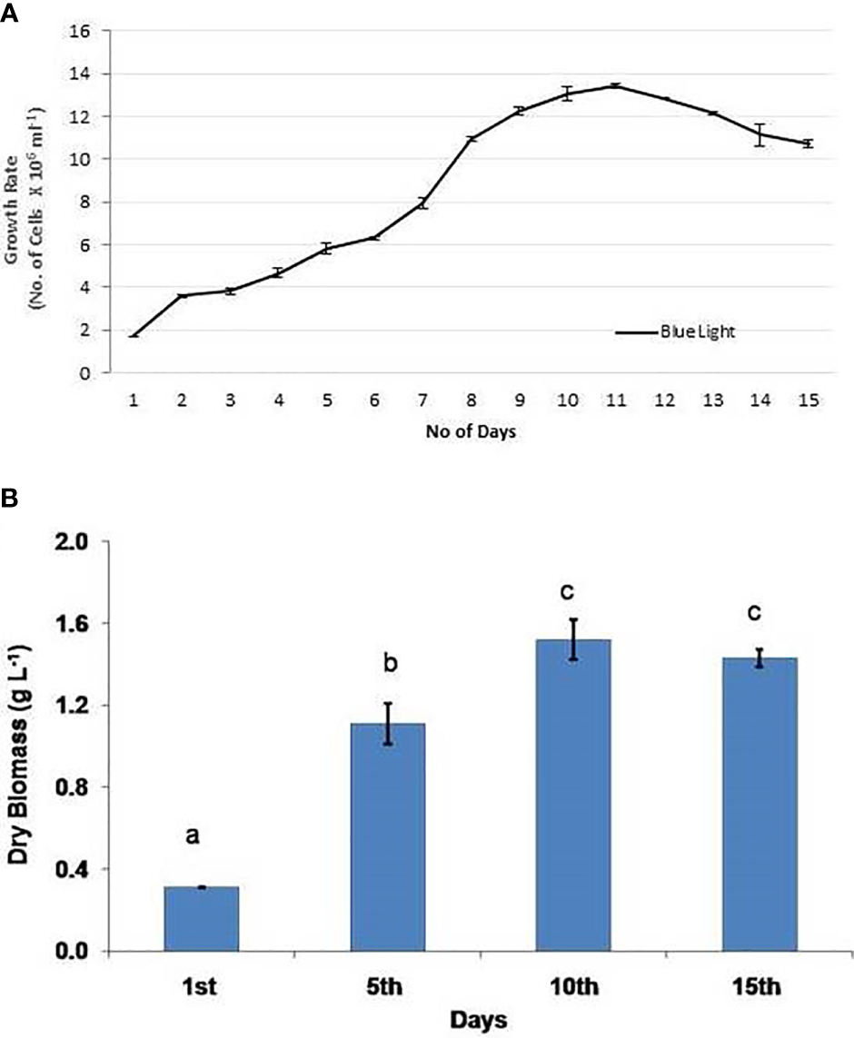 On the basis of individual tests performed under various environmental conditions, the ideal environmental factors were combined and evaluated for the growth rate of C. vulgaris. The culture was kept at 25°C, pH 8.0, and 30 PSU with light covered with a blue filter. The results were fascinating in that the maximum production of cells and biomass (1.52 g L−1) was recorded under the blue light on the 10th day and was also the highest outcome in comparison with previous trials (Figures 2A, B). A study has also demonstrated that Pavlova lutheri grows at its maximum specific growth rate and has the highest lipid content when exposed to 30 to 40 PSU, pH 7.5 to 9.0, and 24 h of light (Shah et al., 2014). The findings of this study show that blue wavelengths, when combined with optimized environmental factors, favored the better growth rate of the algae and also enhanced the biomass production to a significant extent.