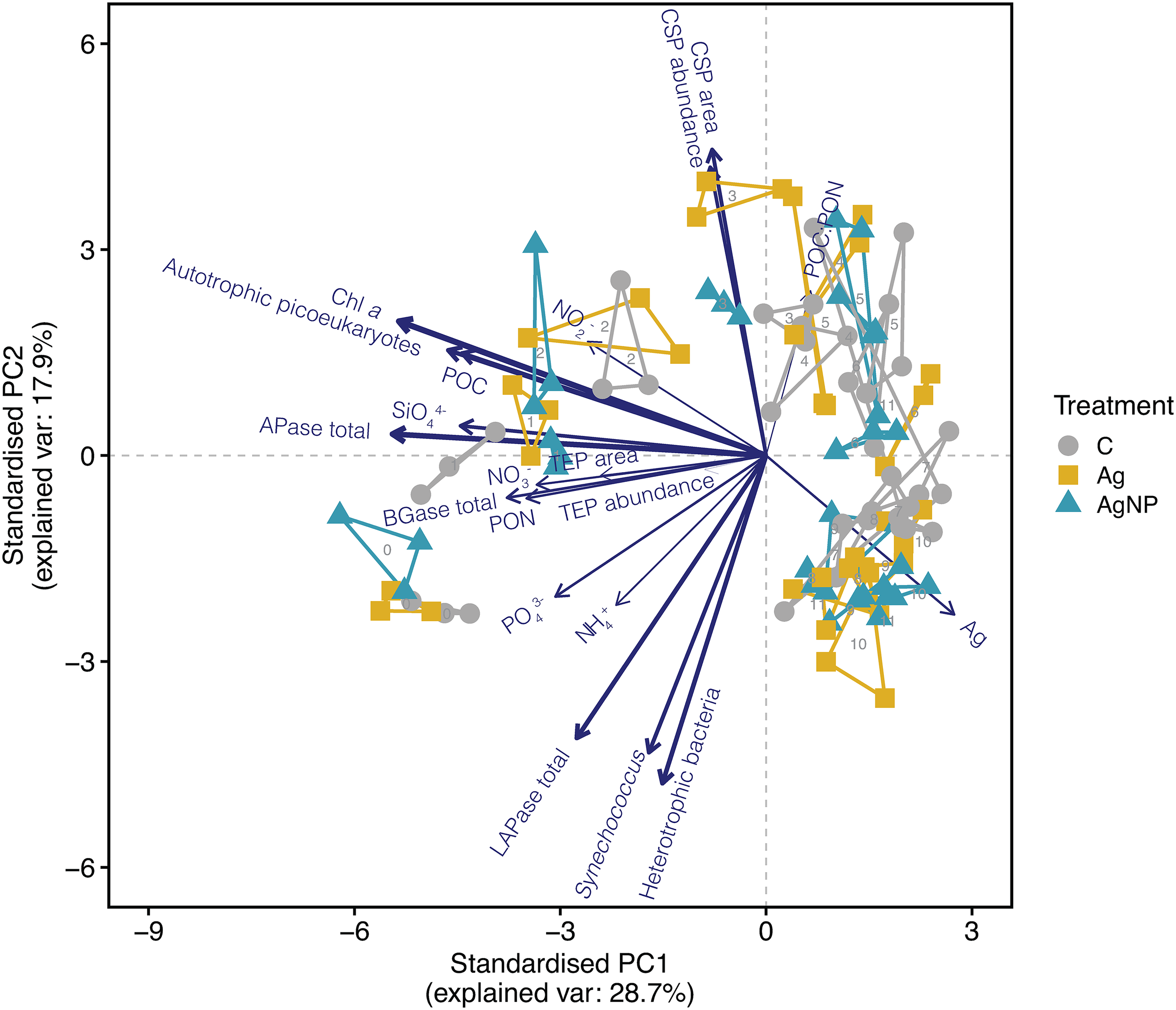 Principal component analysis (PCA) shows the distribution of samples based on biological and chemical variables. The line length and thickness of arrows show the strength of correlation and contribution of variables in driving sample distribution, respectively. The numbers display the day of sampling. Convex hulls group biological triplicates. Abbreviation of treatments: C, unamended controls; Ag, silver ions; and AgNP, silver nanoparticles. Abbreviation of variables: Chl a, chlorophyll a; TEP, transparent exopolymer particles; CSP, coomassie stainable particles; BGase, beta-glucosidase; LAPase, leucine-aminopeptidase; APase, alkaline phosphatase; POC, particulate organic carbon; PON, particulate organic nitrogen; POC : PON, POC to PON ratio; NH4+, ammonium, NO2-, nitrite; NO3-, nitrate; PO43-, phosphate; SiO44-, silicate; Ag, silver concentration added.