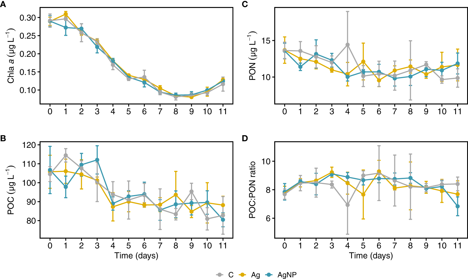 Temporal dynamics of chlorophyll a, particulate organic carbon and nitrogen concentrations in mesocosms. Chl a, chlorophyll a(A) POC, particulate organic carbon (B) PON, particulate organic nitrogen (C) and POC to PON ratios (D) over the time course of the mesocosm experiment. Error bars denote standard deviations of the mean (n = 3). Abbreviation of treatments: C, unamended controls; Ag, silver ions; and AgNP, silver nanoparticles.