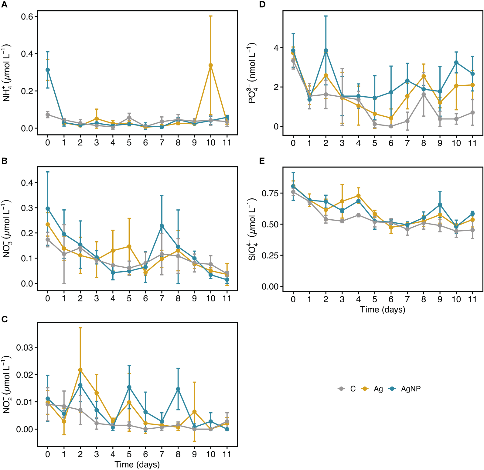 Temporal dynamics of inorganic nutrients in mesocosms. NH4+, ammonium (A) NO3-, nitrate (B) NO2-, nitrite (C) PO43-, phosphate (D) SiO44-, silicate (E). Error bars denote standard deviations of the mean (n = 3). Abbreviation of treatments: C, unamended controls; Ag, silver ions; and AgNP, silver nanoparticles.