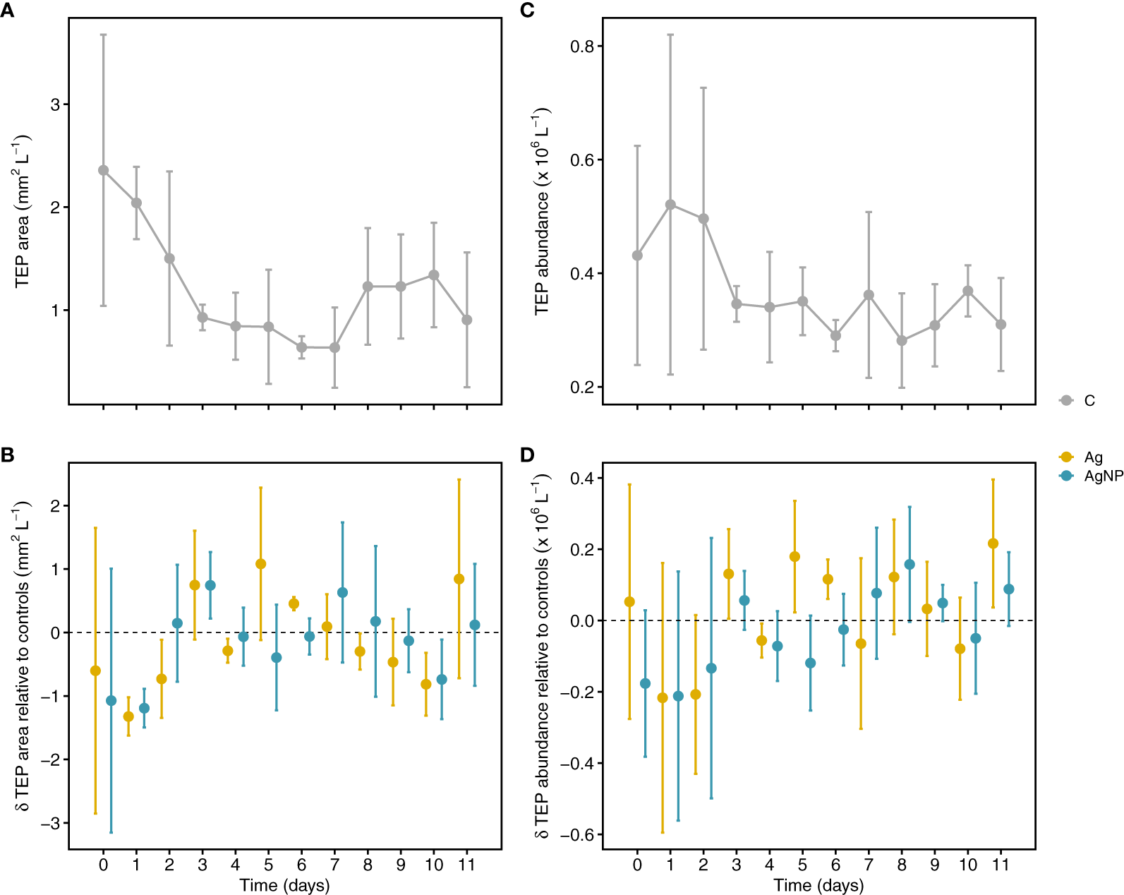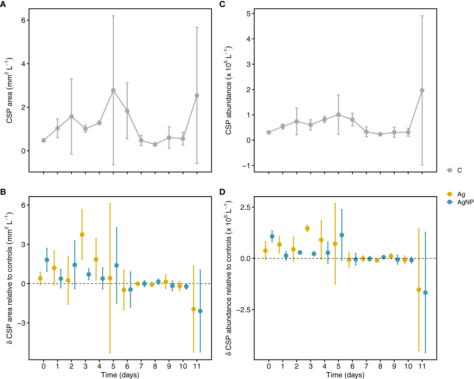 Owing to the high content of amino acids and protein, CSP are veritable hotspots for bacterioplankton colonization (Mari and Kiørboe, 1996; Busch et al., 2017). The abundance of heterotrophic bacteria (HB) associated with CSP showed similar patterns in controls and Ag-amended enclosures, with slightly higher values in the Ag+ treatment (Figure S2). Abundance increased ~4.5 and ~3-fold from D0 to D5, respectively, and decreased thereafter to roughly initial values. In enclosures amended with AgNP, in turn, CSP-attached HB abundance increased over time, from 0.58 ± 0.25 × 106 cells L-1 to 2.7 ± 0.6 × 106 cells L-1 on D0 and D7, respectively (Figure S2). However, no significant difference in CSP-attached bacteria was found among experimental conditions.