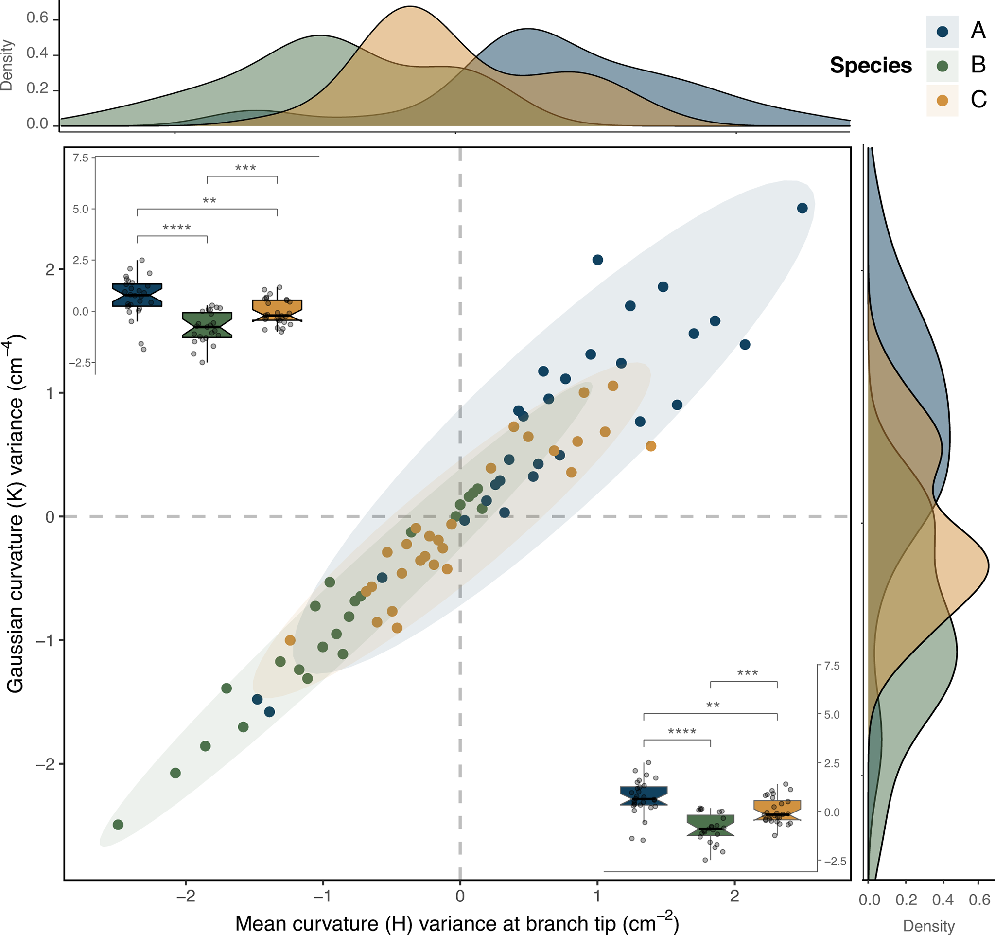 Comparison of two correlated curvature variables that displayed significant differences between the three species (ANOVA and post-hoc Tukey tests, α = 0.05), but where the species morphospaces overlapped: mean curvature variance at branch tip vs. Gaussian curvature variance (H_tip_var vs. K_var). In the center, a scatter plot depicts the two variables, correlation (Pearson correlation coefficient ρ = 0.96), along with their density distributions along each axis. Box plots in each corner display the significant differences in the mean values of the variables according to pairwise interspecific comparisons (p-values significance: **≤ 0.01, ***≤ 0.001, ****≤ 0.0001).