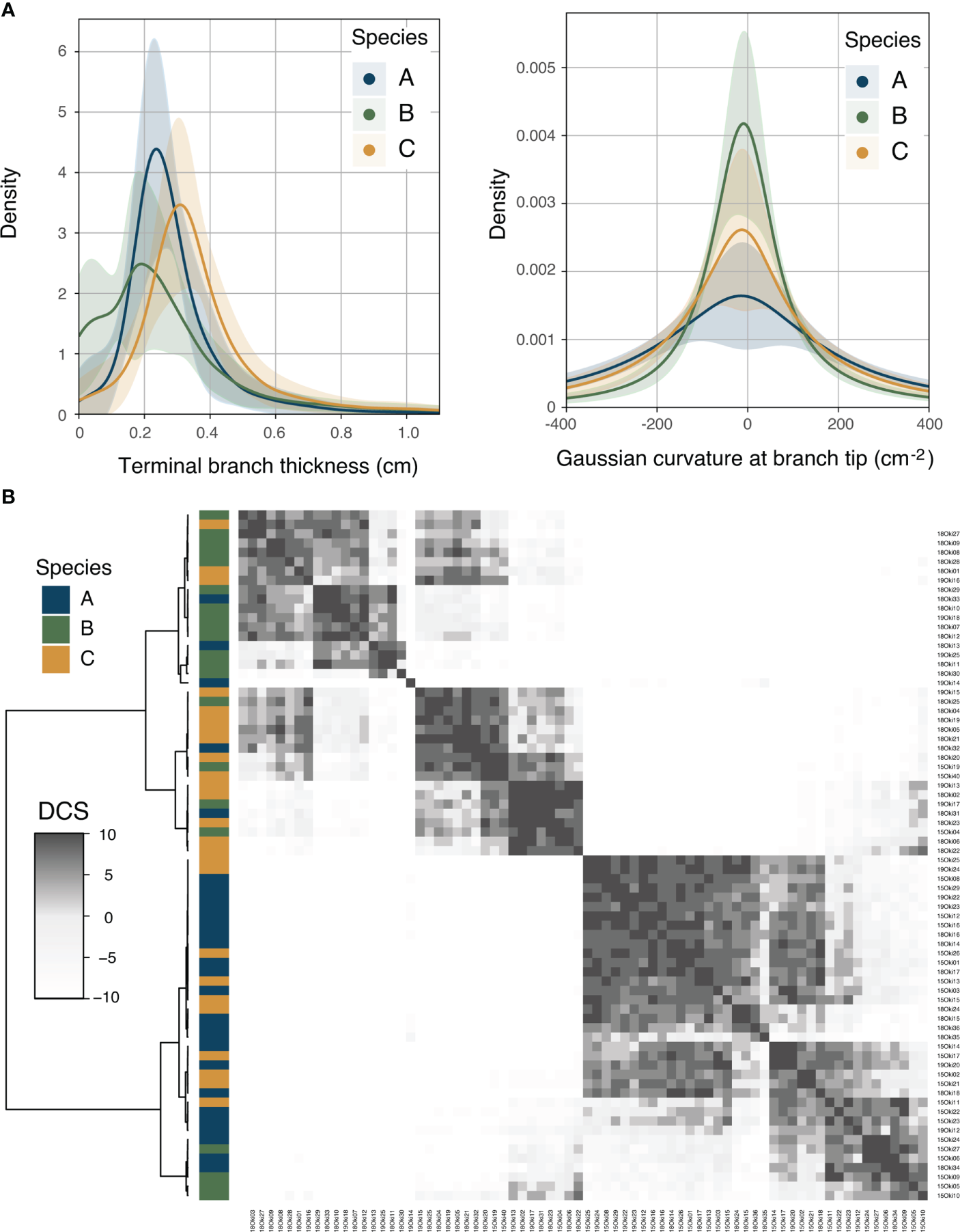 Kernel density distribution analyses. (A) Probability density functions of the terminal branch thickness (dc) and the Gaussian curvature at branch tip (K_tip) for each of the species. (B) Heatmap depicting recoded and summarized p-values obtained from two-sample Mann-Whitney U tests for minimum curvature (k2). Samples were re-organized using hierarchical clustering according to similarity in pairwise comparisons, calculated as the distribution comparison score (DCS) or the cumulative value of similarity according to the p-value significance cut-off (α = 0.05).