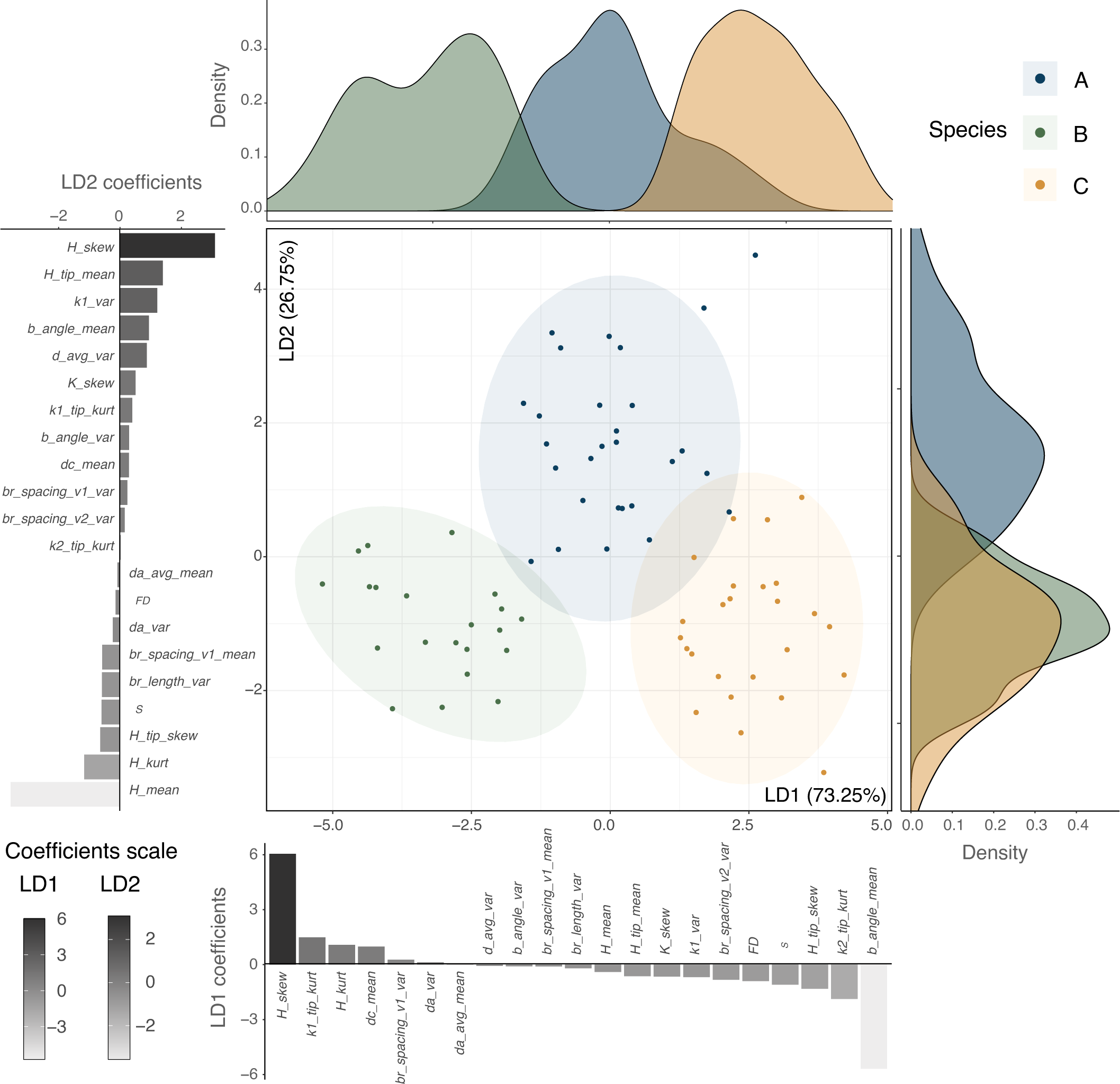 Discriminant multivariate analysis using a subset of variables. Linear discriminant analysis (LDA) using the variables that present no collinearity (Variance Inflation Factor (VIF) < 10, 21 variables) displaying the percentage of trace for each main discriminant. Distribution densities for each one of the linear discriminants are plotted along the axes, along with the scaling coefficients for each variable.