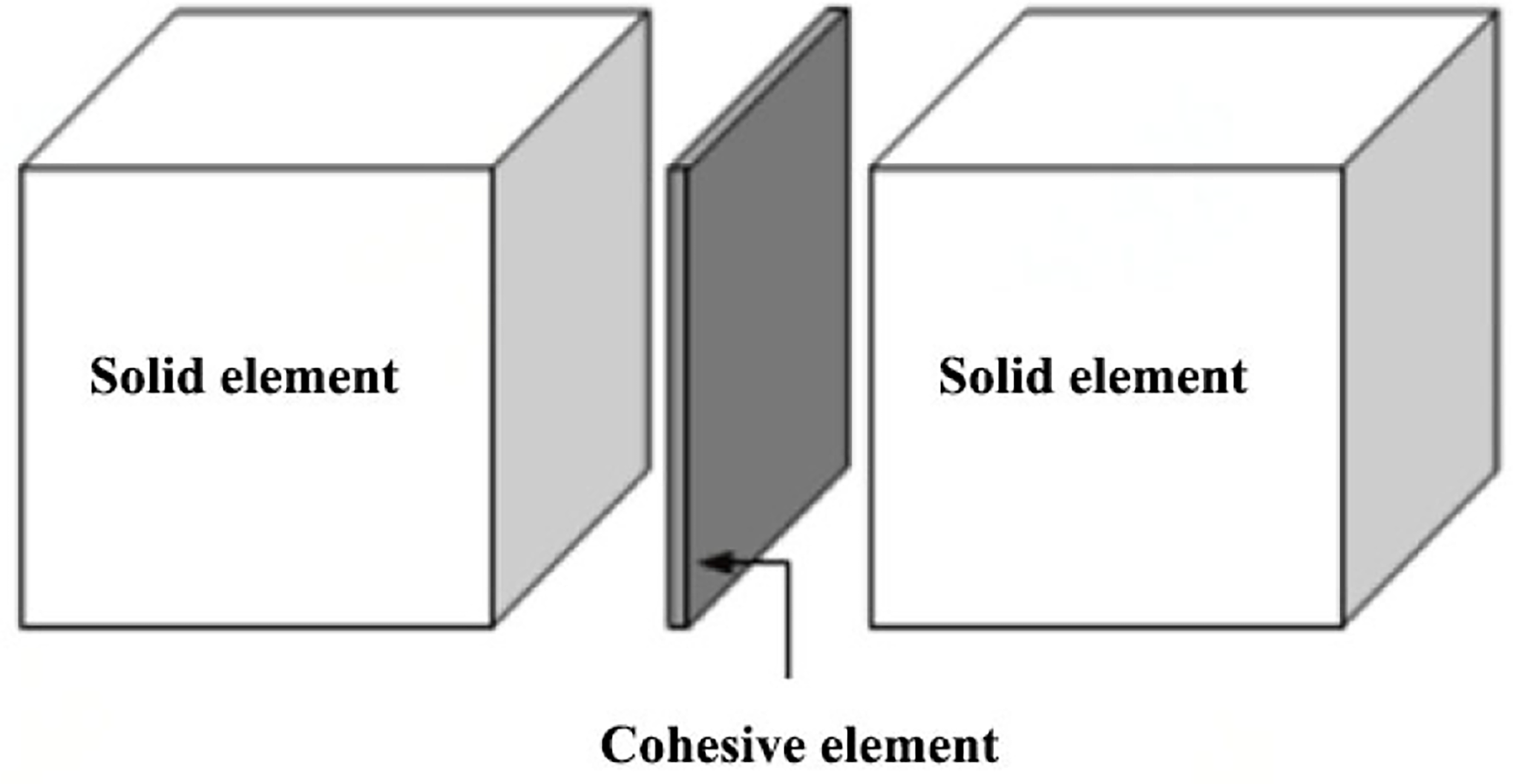 The cohesive element model is a complex numerical algorithm extended under the finite element framework of the cohesion model (Hillervborg et al., 1976). This method divides the ice mesh into traditional solid elements and cohesive elements. Firstly, the solid ice elements are discretized, and then cohesive elements are inserted between the solid ice elements in the horizontal and vertical directions, as shown in Figure 1. Sequentially, solid ice elements share nodes with cohesive elements to transfer deformations and stresses. Through the action of external loads, the solid ice element is deformed, which, in turn, leads to the corresponding displacement of the cohesive element nodes. During the interaction simulation, once the cohesive element reaches the maximum separation displacement, it is considered to be completely destroyed and removed, resulting in the formation of obvious cracks on the ice surface and inside. Meanwhile, some fractured solid ice elements shall adhere to the surface of the ice sheet to form the accumulation of ice fragments. It is worth noting that the failure of cohesive elements is theoretically based on fracture mechanics; however, the actual CEM is based on damage mechanics.