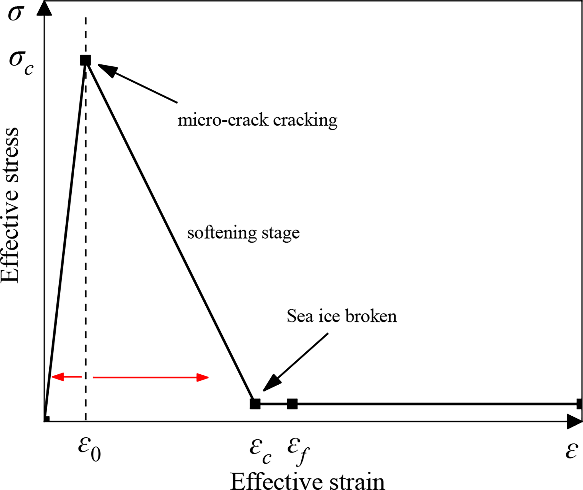 where ϵ0 is the initial strain, which can be adjusted according to the ice test data. Based on the research results of the Norwegian University of Science and Technology, such parameter is selected as 0.01; P is the hydrostatic pressure.