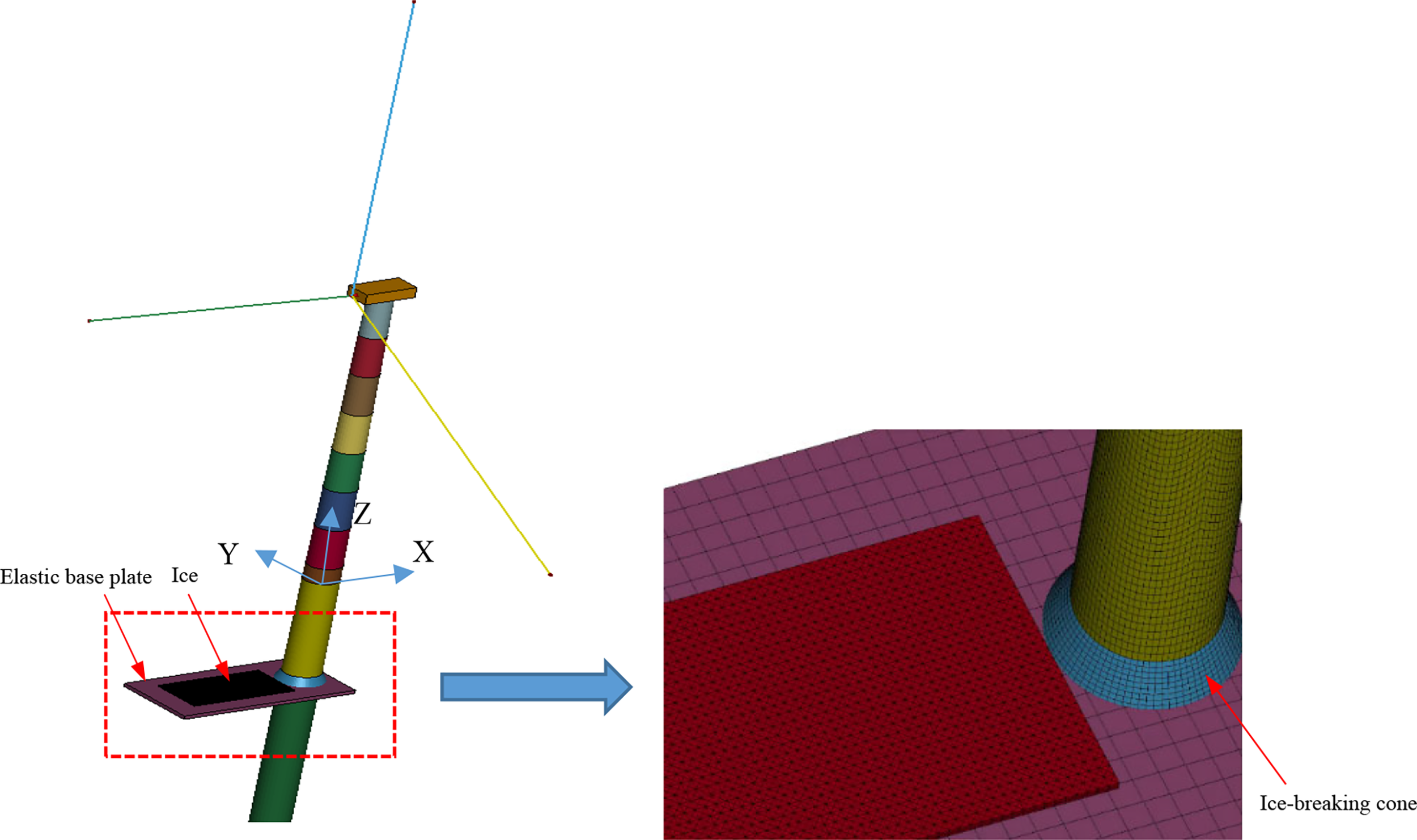 Currently, most studies on the dynamic response of OWTs under sea ice were carried out through ice force time histories or simplified ice force models. Based on the bending failure model of ice, Shi et al. (2016) developed a calculation program for the interaction between ice and OWTs in the coupled numerical analysis software, HAWC 2. The coupled dynamic response characteristics of the OWT were analyzed under different ice thicknesses and speeds. A forced ice-induced vibration model was used to simulate the motion response of OWTs under the action of turbulent wind and ice by (Ye et al., 2019). Based on the FAST numerical calculation software, a simplified ice force model was adopted to compare the dynamic response of monopile OWTs under the floating ice by Heinonen and Rissanen (2017). The Karna ice force spectrum model was implemented in analyzing the influence of ice loads and wind loads on the OWT fatigue by Wang (2015), and found that the influence of ice loads on the fatigue damage of OWT substructure was greater than that caused by wind loads.