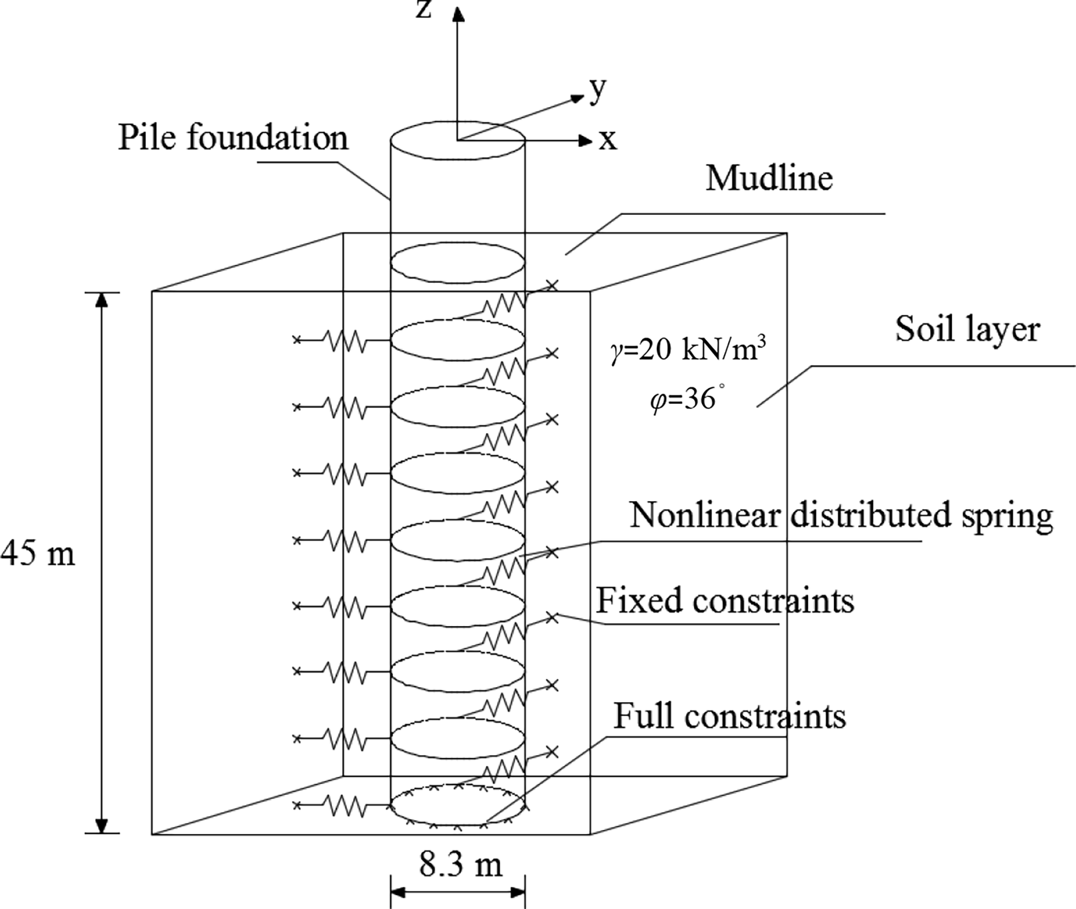 In this paper, nonlinear distributed springs are adopted in simulating the pile–soil interaction of OWT foundations under the sea ice and wind. Based on the p–y curve method, the stiffness and damping of the spring element are determined, among which the spring damping cs adopts frequency-independent radiation damping per unit length (Wang et al., 1980):