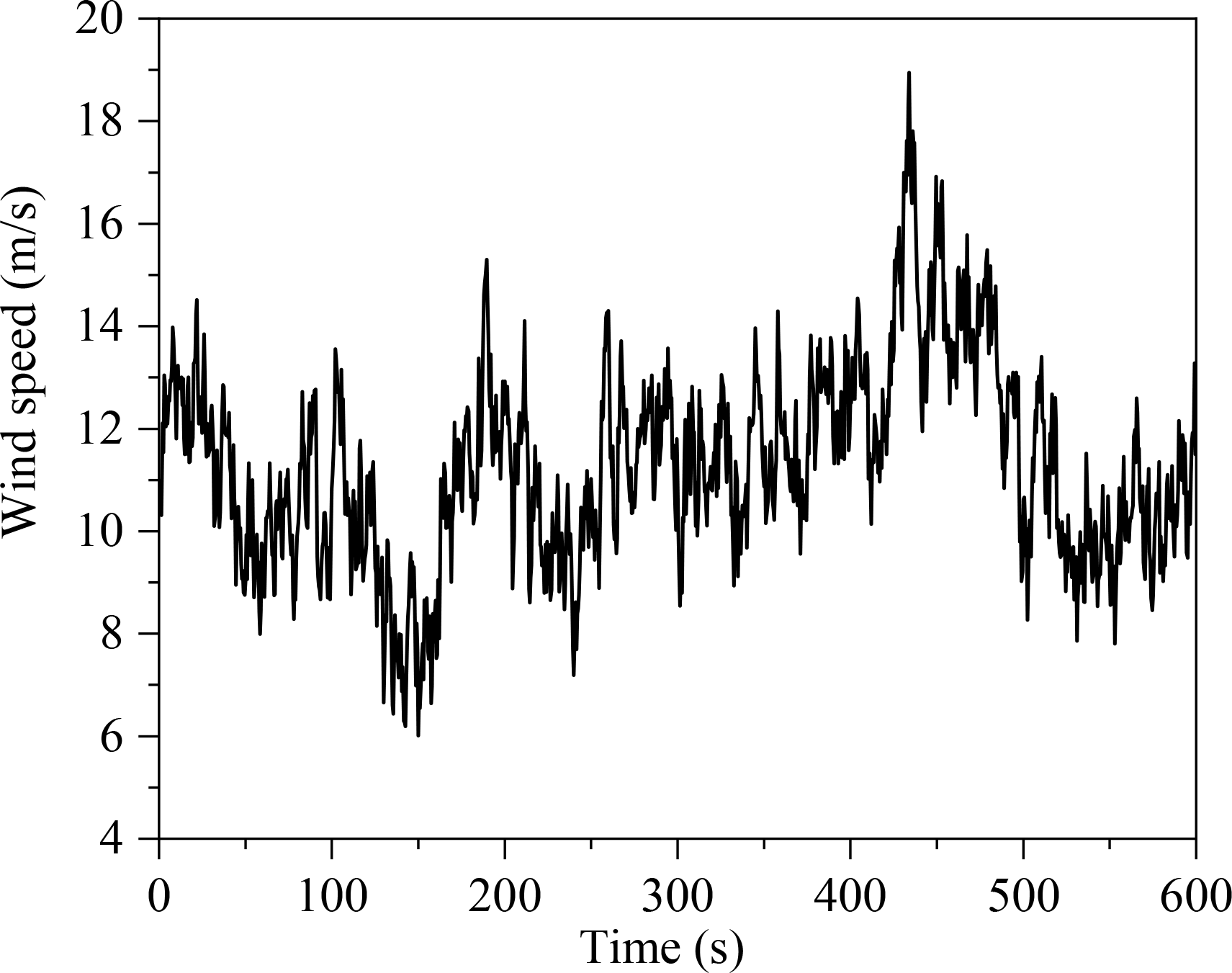 The average reference wind speed at the hub height of the OWT is a rated wind speed of 11.4 m/s and a specified turbulence intensity of 0.146 is selected in the presented study. Using the IEC Kaimal turbulence model and exponential coherence model, a turbulent wind field with a time step of 0.02 s is generated by TurbSim (Kilcher, 2012). The time-domain variation curve of wind speed at the hub height is shown in Figure 8. In addition, the cone angle conditions (LC 2.1–LC 2.3) only changed the cone angle by keeping the identical diameter of the water surface of the cone, that is, ensuring a uniform collision position of sea ice, as shown in Figure 9.