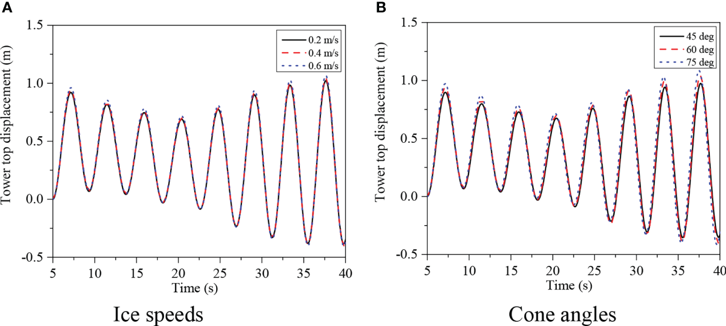 In order to ensure that the initial contact is eliminated between the OWT substructure and ice, an initial collision distance of 0.1 m is set in the fully coupling interaction model. The contact for eroding surface to surface is applied to the interaction of ice and OWT. However, in order to reduce the computation time, the contact between ice fragments adopts eroding single surface contact. Simultaneously, the contact stiffness is increased by four to five times to reduce unnecessary penetration between ice and the OWT substructure. It is found that such contact stiffness can obtain better numerical simulation results through tests (Liu et al., 2022).