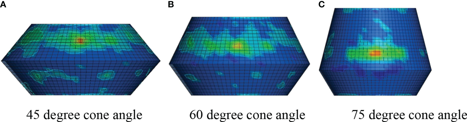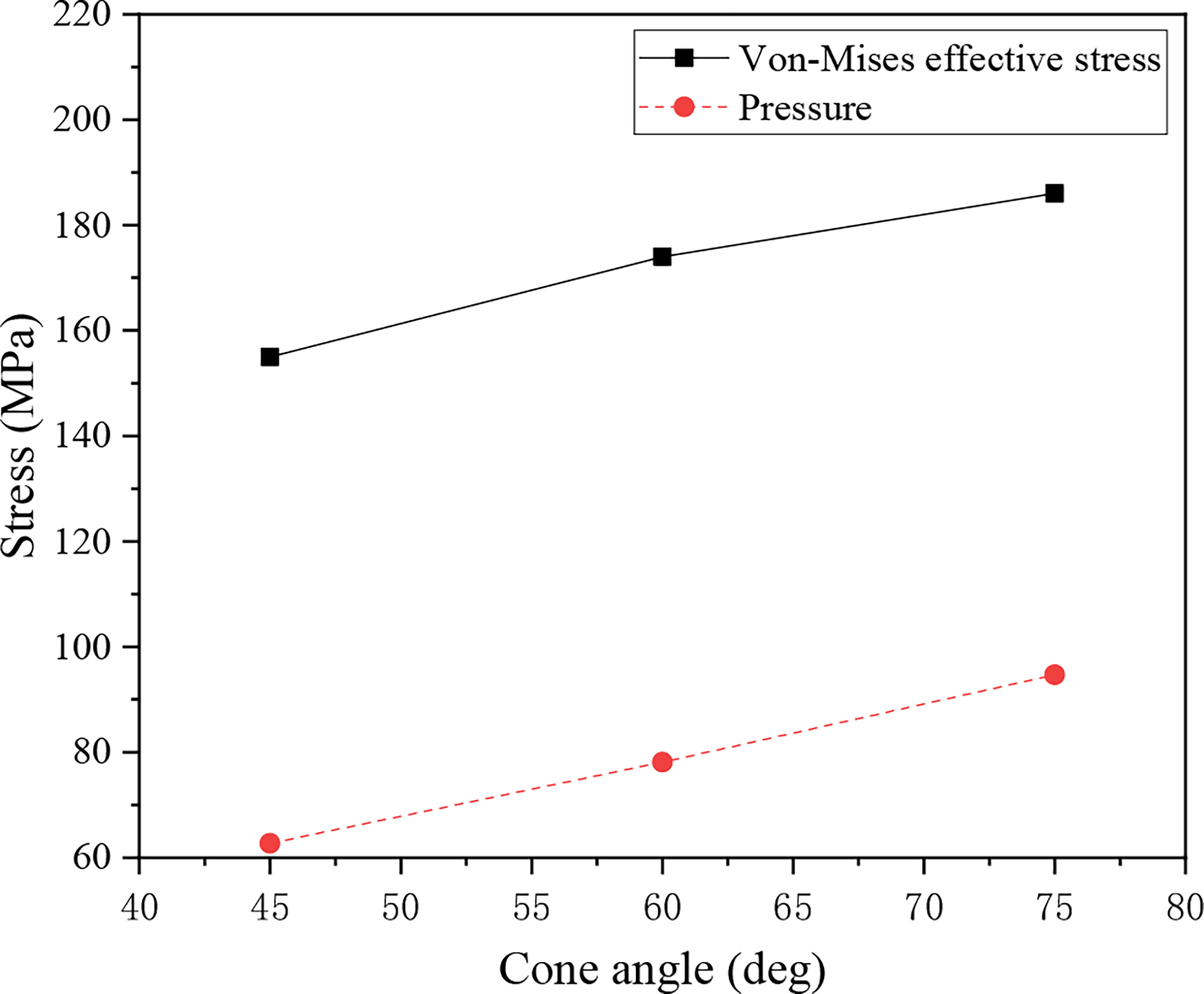 The remarkable discrepancies in the damage of the ice-breaking cone surface with different cone angles can be directly observed. The Von-Mises effective stress distribution is consistent with pressure distribution. With the increase of the cone angles, the stress damage area and effective stress amplitude are also positively correlated. However, the maximum Von-Mises effective stress is much smaller than the yield strength of the steel material. This indicates that the linear analysis of the OWT structure in the elastic range is also reasonable for the ice-conical OWT structure interaction process.
