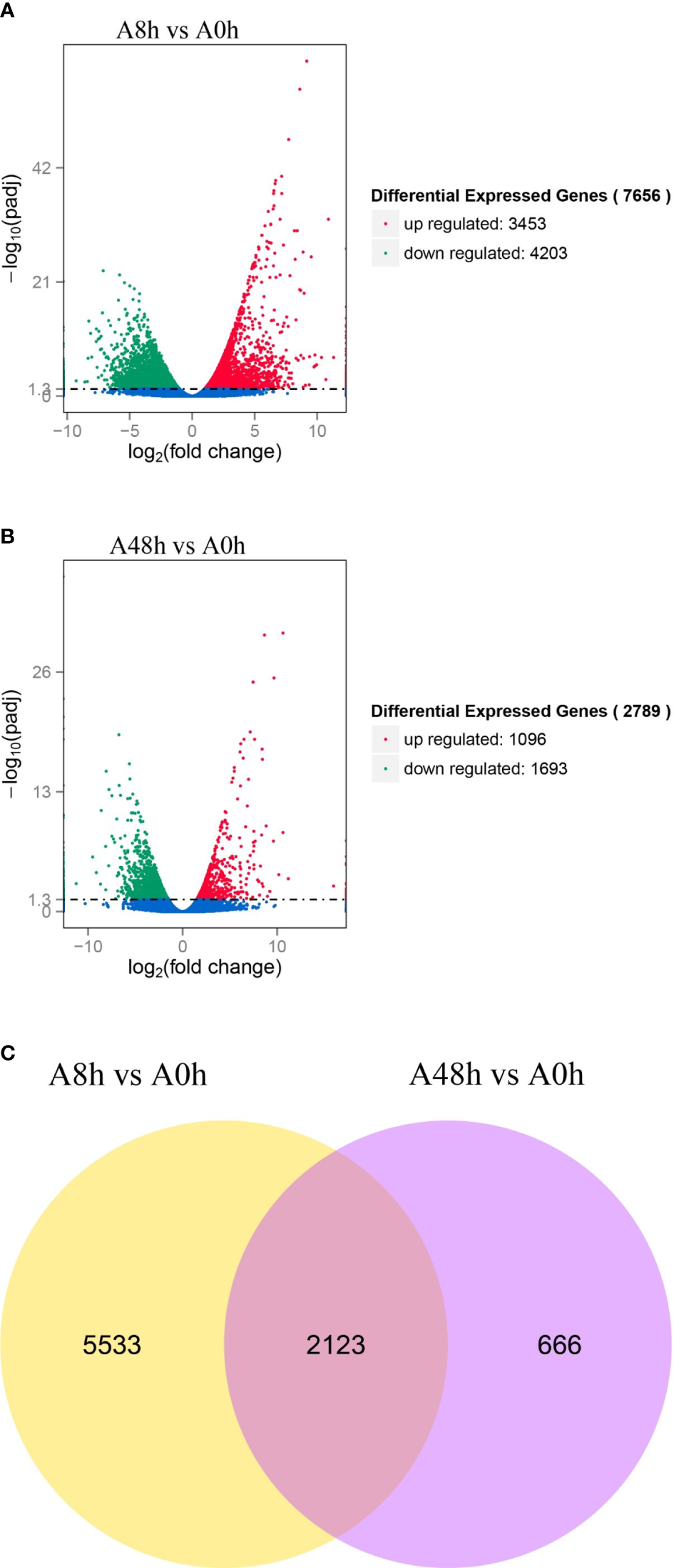 (A) Volcano plot of differentially expressed genes (DEGs) distribution trends between A8h vs. A0h sample. (B) Volcano plot of DEGs distribution trends between A48h vs. A0h sample. Each dot in the volcano plot represents a detected gene. Genes with significant differential expression are denoted by red dots (upregulated) and green dots (downregulated). Genes without significant differential expression are indicated by blue dots. Horizontal ordinate signifies the fold change of DEGs, whereas vertical ordinate stands for statistical significance of DEGs between A8h vs. A0h and A48h vs. A0h groups. (C) Venn diagrams of DEGs. There are 7,656 and 2,789 DEGs between A8h vs. A0h and A48h vs. A0h, respectively. Among all DEGs, a total of 2,123 differential genes were overlapped expressed both in A48h and A8h groups compared with unchallenged group.