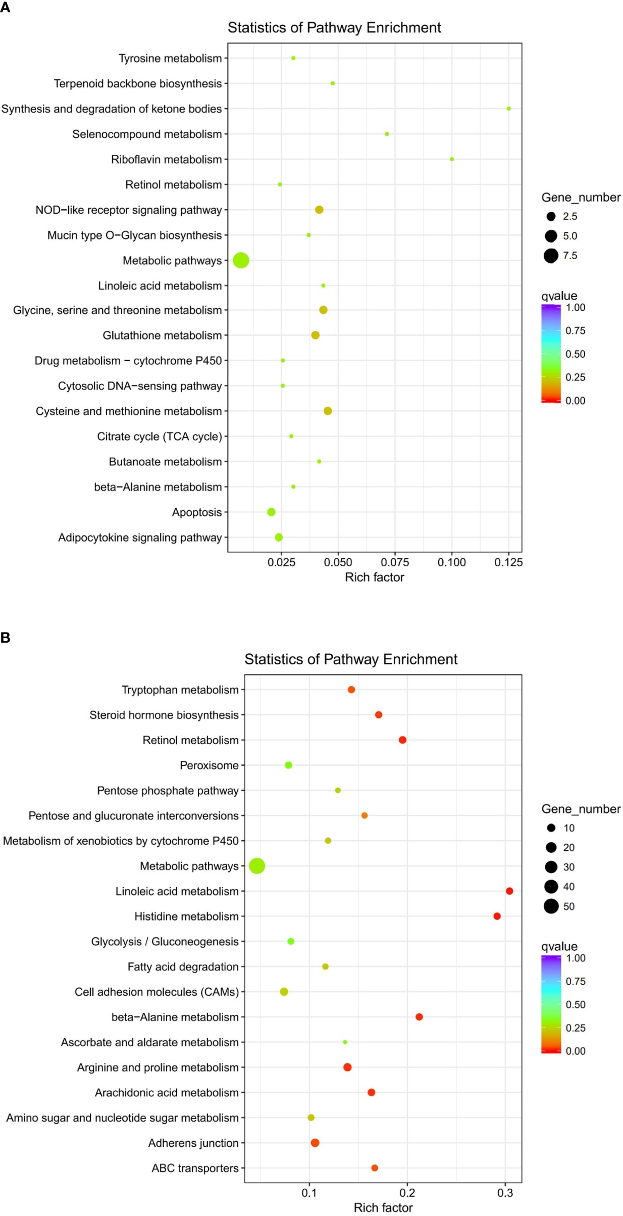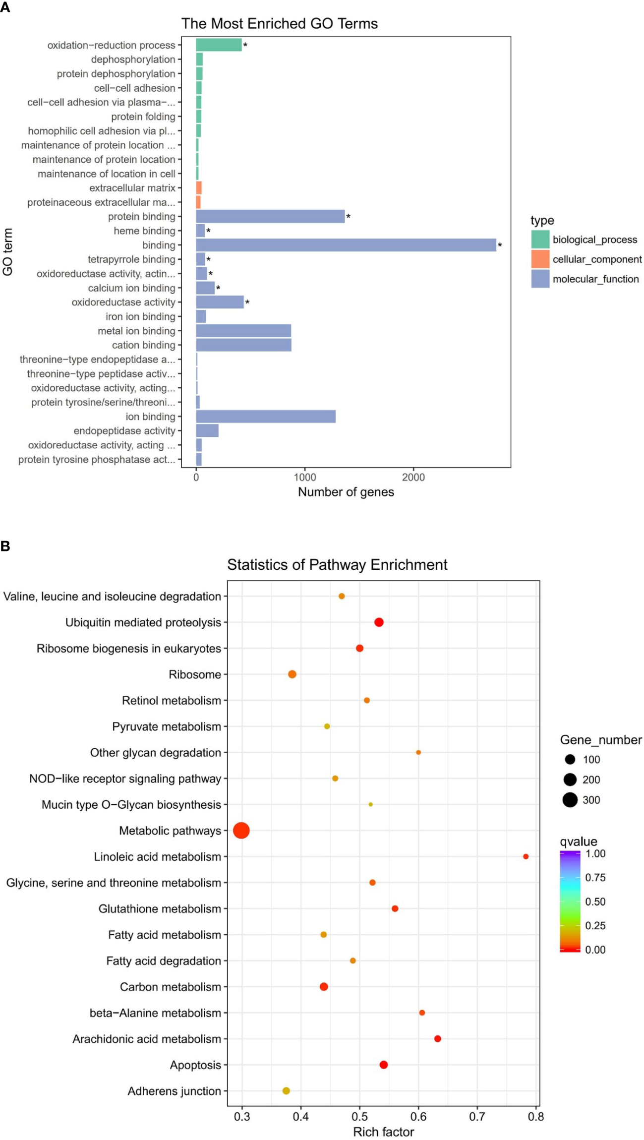 (A) Gene ontology (GO) enrichment analysis of differentially expressed genes (DEGs). Significantly enriched GO term was highlighted with star (*) inside the graph (adjusted P < 0.05). (B) Scatter plot of Kyoto Encyclopedia of Genes and Genomes (KEGG) enrichment analysis of DEGs. The vertical axis represents the pathway terms, whereas the horizontal axis signifies the rich factor. The size of the dot represents the number of DEGs in this pathway, and the color of the dot is consistent with different Q-value ranges.