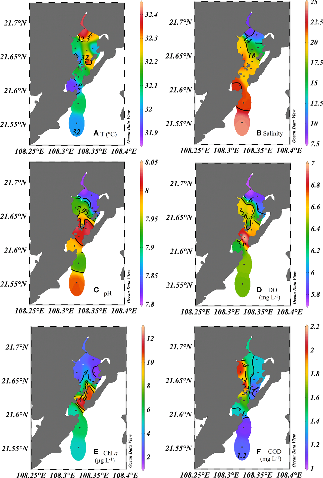 Spatial distributions of physicochemical parameters, including temperature (A), salinity (B), pH (C), DO (D), Chl a(E) and COD (F), in Xi Bay during the rainy season.
