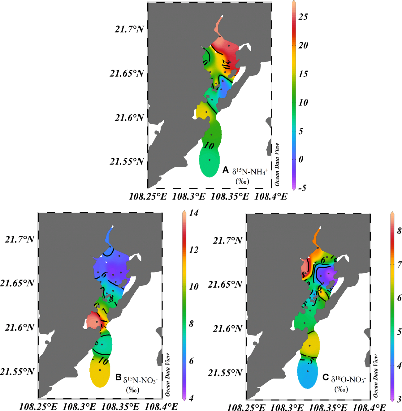 Spatial distributions of nutrients in Xi Bay during the rainy season. (A), δ15N-NO3-(B), δ18O-NO3-(C), δ15N-NH4+