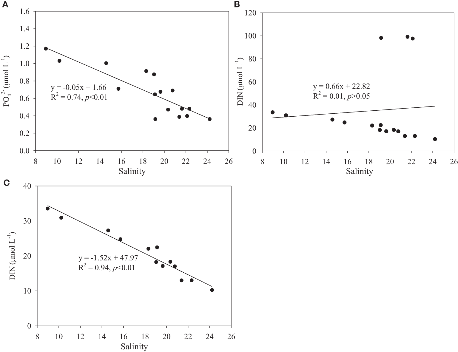 The linear relationship between PO43- and salinity all stations of Xi Bay (A); the linear relationship between DIN and salinity all stations of Xi Bay(B); the linear relationship between DIN and salinity in Xi bay that exclude the stations in the bay mouth (C).