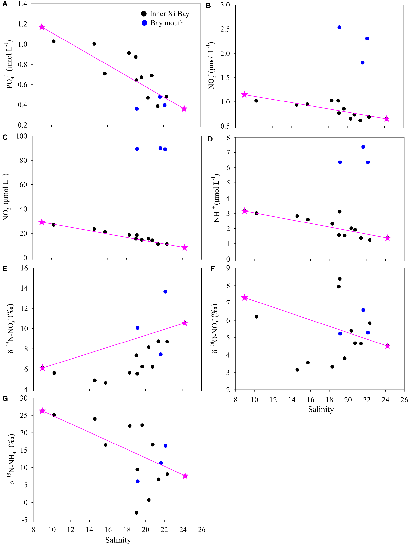 Distribution of nutrients and isotopic values against salinity in Xi Bay. The black dots are the samples excluding the stations in the bay mouth of Xi Bay; the blue dots are the samples in the bay mouth. The pink lines indicate the mixing line. The inner bay includes the upper bay and lower bay (stations X1 to X12); the bay mouth includes stations X13 to X15. (A), PO43-(B), NO2-(C) NO3-(D) NH4+(E), δ15N-NO3-(F), δ18O-NO3-(G), δ15N-NH4+