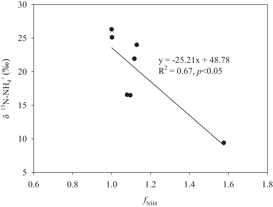 Linear relationship between δ15N-NH4+ and fNH4 in the upper bay.