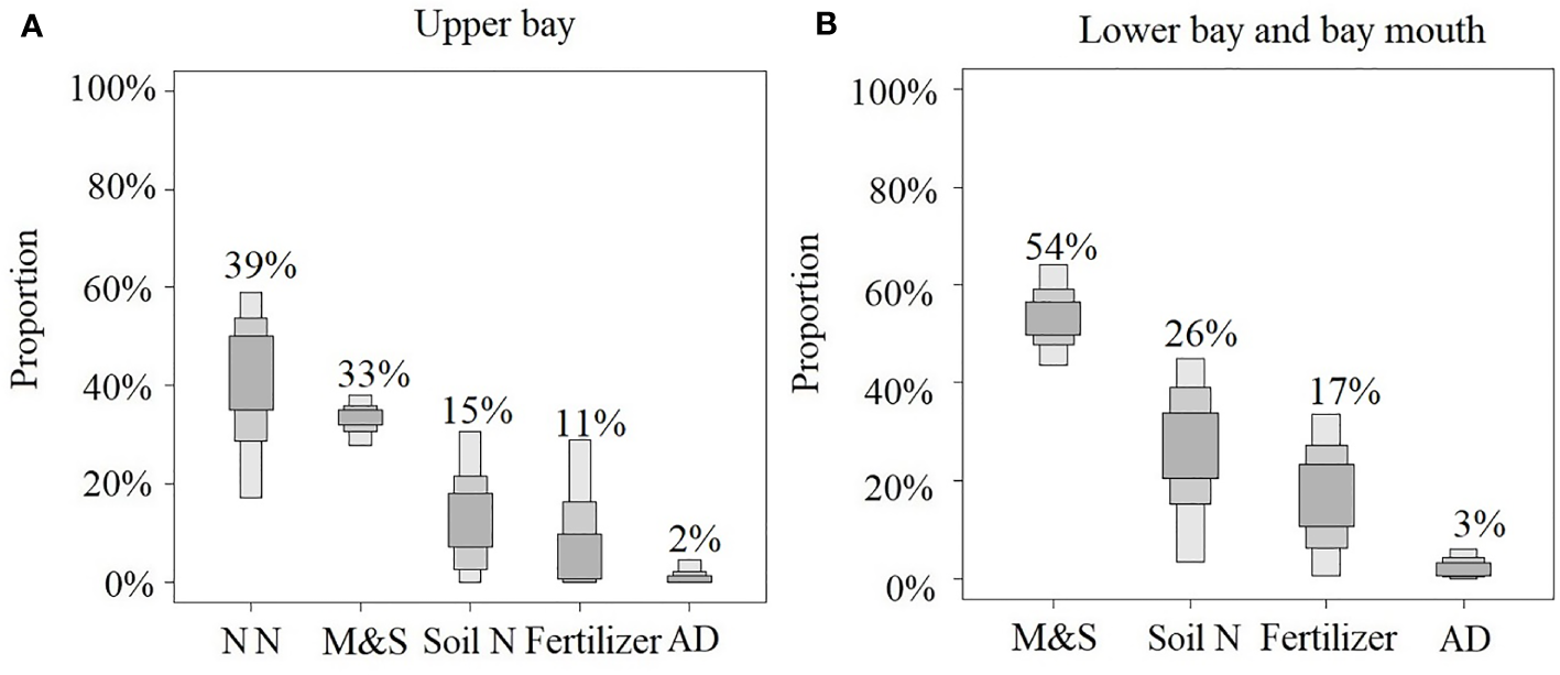 Proportion of potential nitrate sources in bay A during rainy season. (A) Proportion of potential nitrate sources in Upper bay, (B) Proportion of potential nitrate sources in Low bay and bay mouth. NN: nitrate from nitrification.