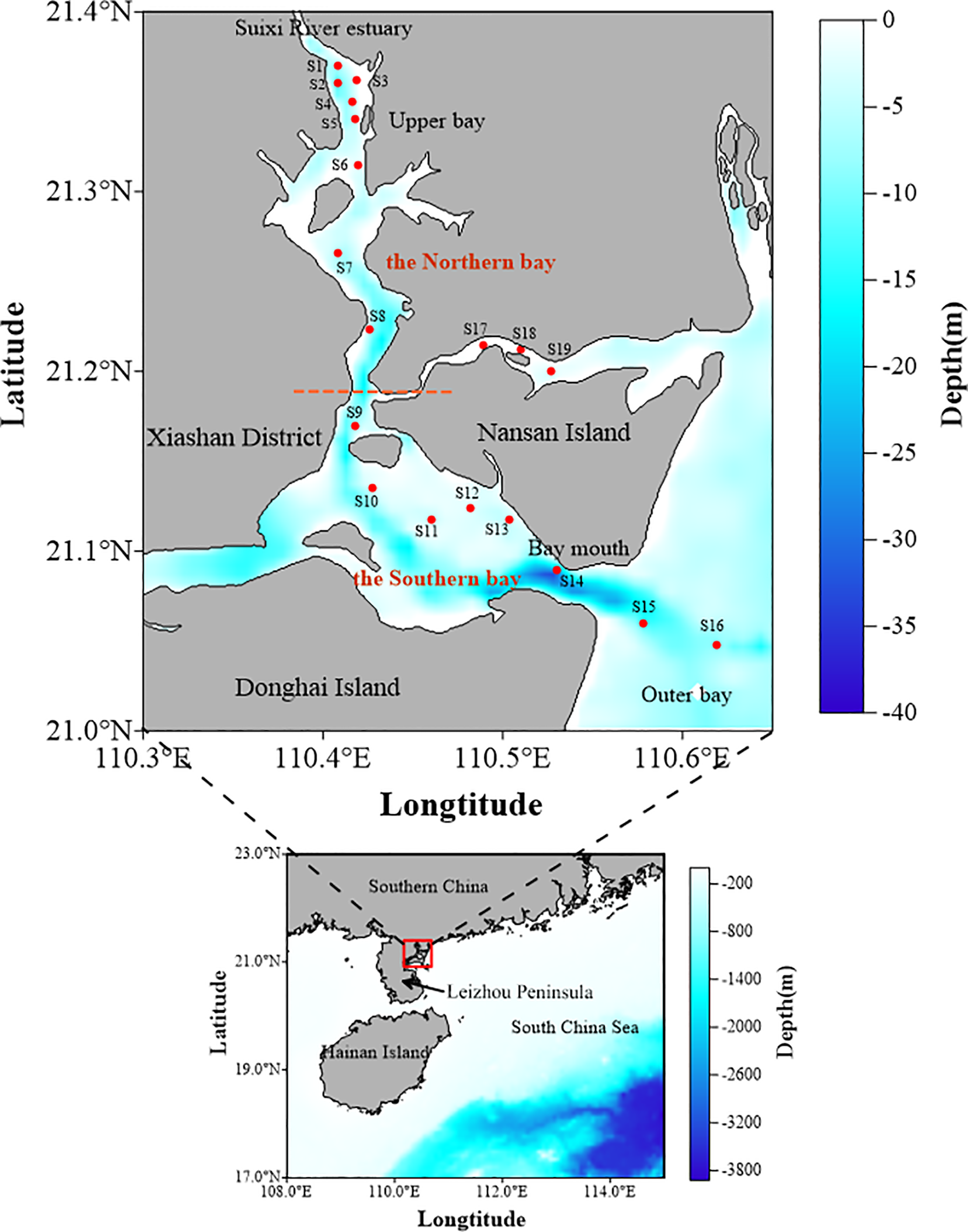 Zhanjiang Bay, located in the east of Leizhou Peninsula in China, is a typical semi-closed bay surrounded by islands and a peninsula. In this study, Zhanjiang Bay is divided into two parts according to the terrain: the northern bay and the southern bay (Figure 1). The northern bay is mainly composed of the estuary of the Suixi River, with shallow water depth. Among them, the Suixi River, the main river of Zhanjiang Bay, is about 80 km long with an annual average flow of 10.4 × 108 m3. The southern bay is the major broad water in the bay, which is connected with the South China Sea through the southeastern bay mouth. Affected by narrow terrain, poor hydrodynamic conditions, and the influence of steady wind–east wind, the half exchange time of water in the northern bay was more than 100 days, and that in the southern bay was 30 days (Li, 2012). Zhanjiang Bay is also a bay deeply affected by human activities, where the degree of eutrophication of the bay is high, and many sewage outlets in the northern bay exist (Yu et al., 2017; Yu et al., 2021; Zhang et al., 2021).