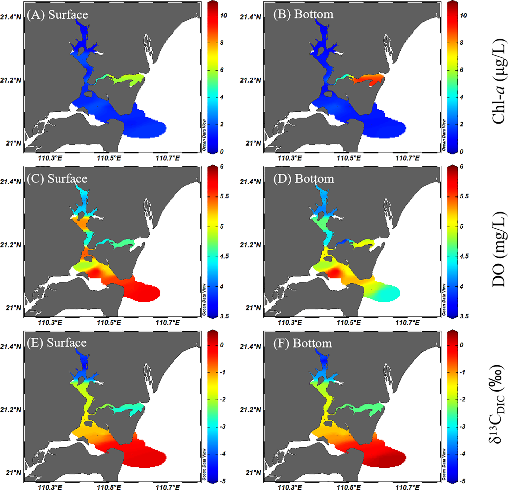 Spatial distributions of Chl-a (A, B), DO (C, D), and stable isotope of DIC (E, F) in surface and bottom water of Zhanjiang Bay during the sampling period. Chl-a, chlorophyll a; DO, dissolved oxygen; DIC, dissolved inorganic carbon.