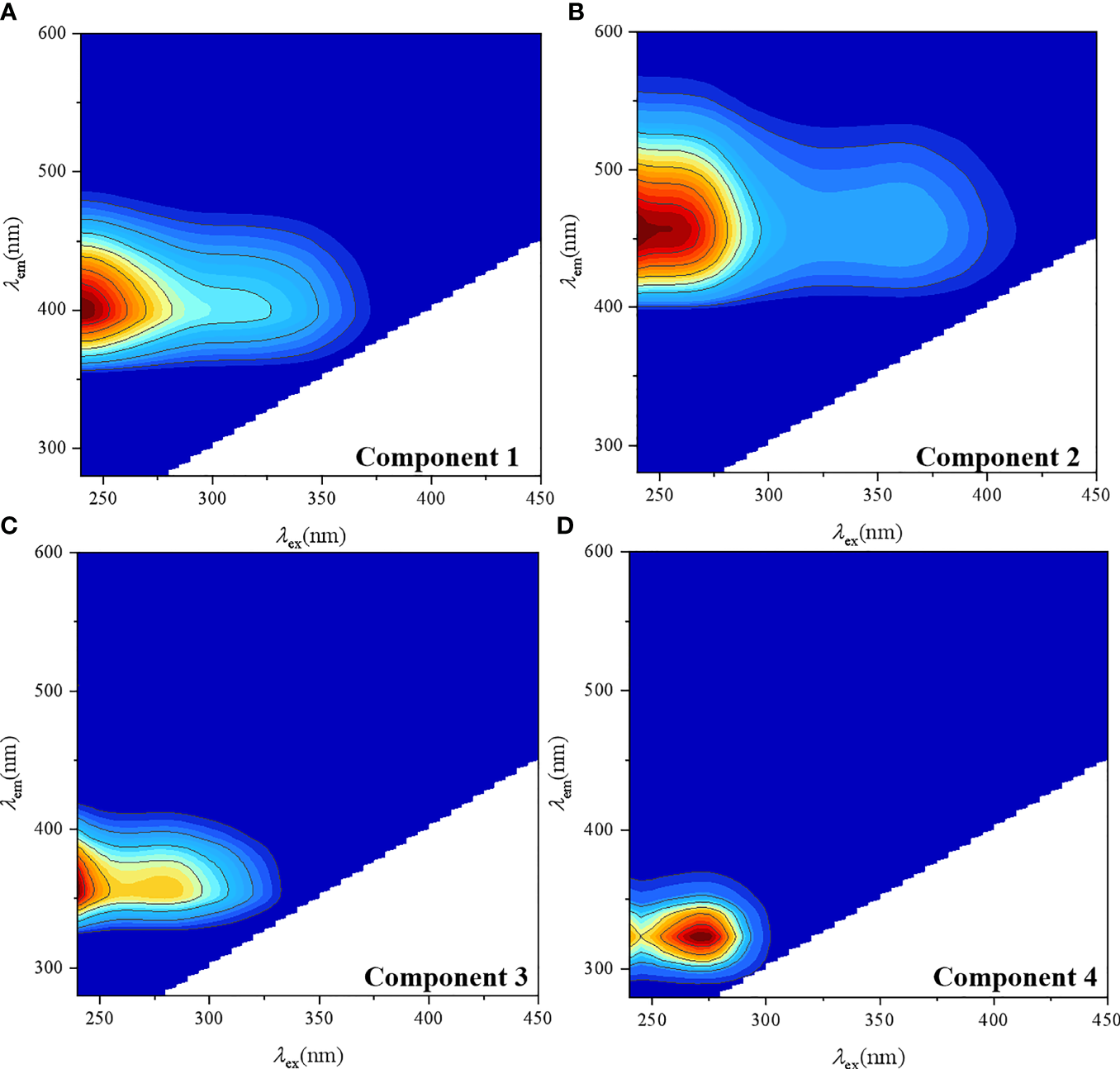Two humic-like components (C1–C2) and two protein-like components (C3–C4) were identified using the PARAFAC model in this study (Figure 4). C1 showed an excitation maximum at ≤240 nm and an emission maximum at 400 nm, which had been considered a marine humic-like fluorescence peak M previously (Coble, 1996). C2 displayed an excitation maximum at 250 nm and an emission maximum at 456 nm, which used to be classified into a mixture of terrestrial humic-like fluorescence peak C and peak A (Coble, 1996). C3 has two excitation maxima at ≤240 and 280 nm and an emission maximum at 356 nm, which have previously been reported as tryptophan-like fluorescence peak T (Coble, 1996). C4 had an excitation/emission maximum at 270/324 nm, which was attributed to protein-like fluorescence peak B and peak T (Coble, 1996).