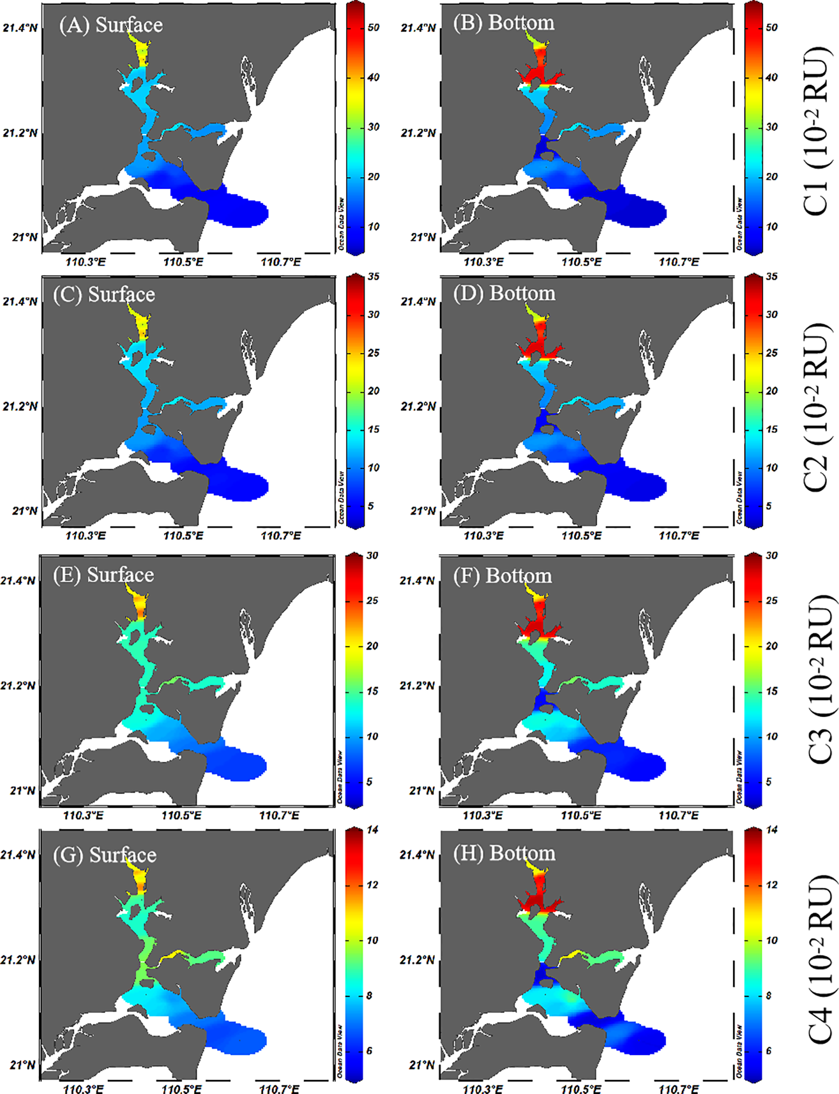 Spatial distributions of fluorescence components C1 (A, B), C2 (C, D), C3 (E, F) and C4 (G, H) in the surface and bottom water of Zhanjiang Bay during the sampling period.