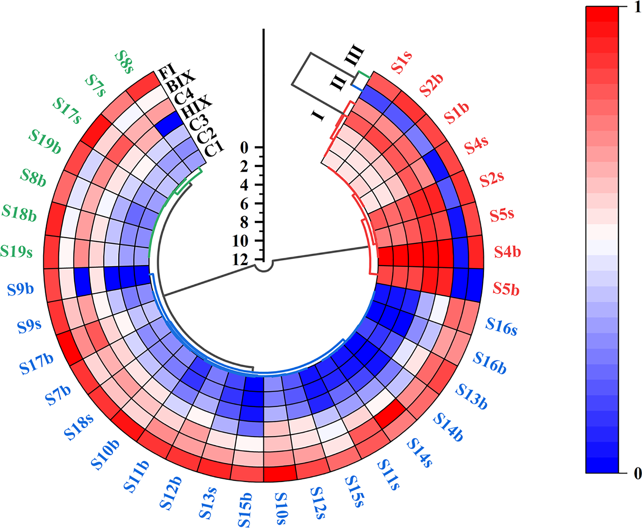 A dendrogram with heatmap of DOM fluorescent components and optical indexes at each sampling site in Zhanjiang Bay. DOM, dissolved organic matter.