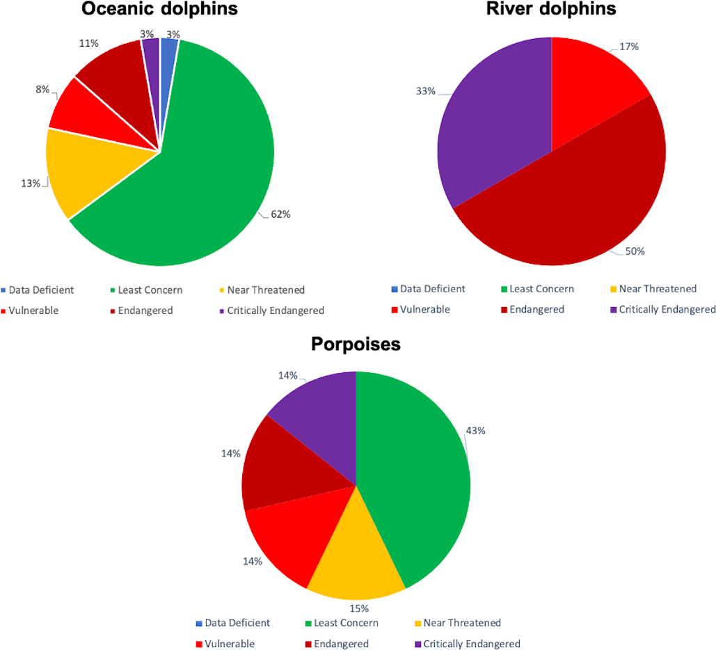 IUCN Red List status of oceanic dolphins (Delphinidae: n = 37 species), river dolphins (Platanistidae, Iniidae, Lipotidae, Pontoporiidae, n = 6) and porpoises (Phocoenidae, n = 7).