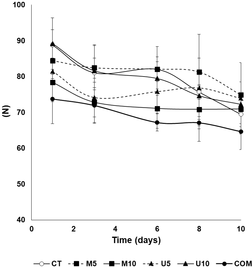 The texture of fillets obtained from the pigmented flank was measured by the compression of the anterior area to the dorsal fin, above the lateral line of fillets using a Texture Analyzer (TXT2 plus “Stable Micro System”), equipped with a load cell of 5 kN, controlled with Texture Expert Exceed 2.52 software (Stable Micro Systems, Surrey, England). Fillet samples were subjected to two consecutive cycles of 25% compression, with 5 s between cycles, in which a 20-mm cylindrical probe was used for pressing downwards into the fillet at a constant speed of 1 mm/s. The textural parameter hardness (maximum force required to compress the sample), springiness (ability of the sample to recover its original form after removing the deforming force), cohesiveness (extent to which the sample could be deformed prior to rupture), gumminess (force needed to disintegrate a semisolid sample to a steady state of swallowing), chewiness (the work needed to chew a solid sample to reach a steady state of swallowing), and resilience (how well a product fights to regain its original position) were calculated as described in Bourne (1978).