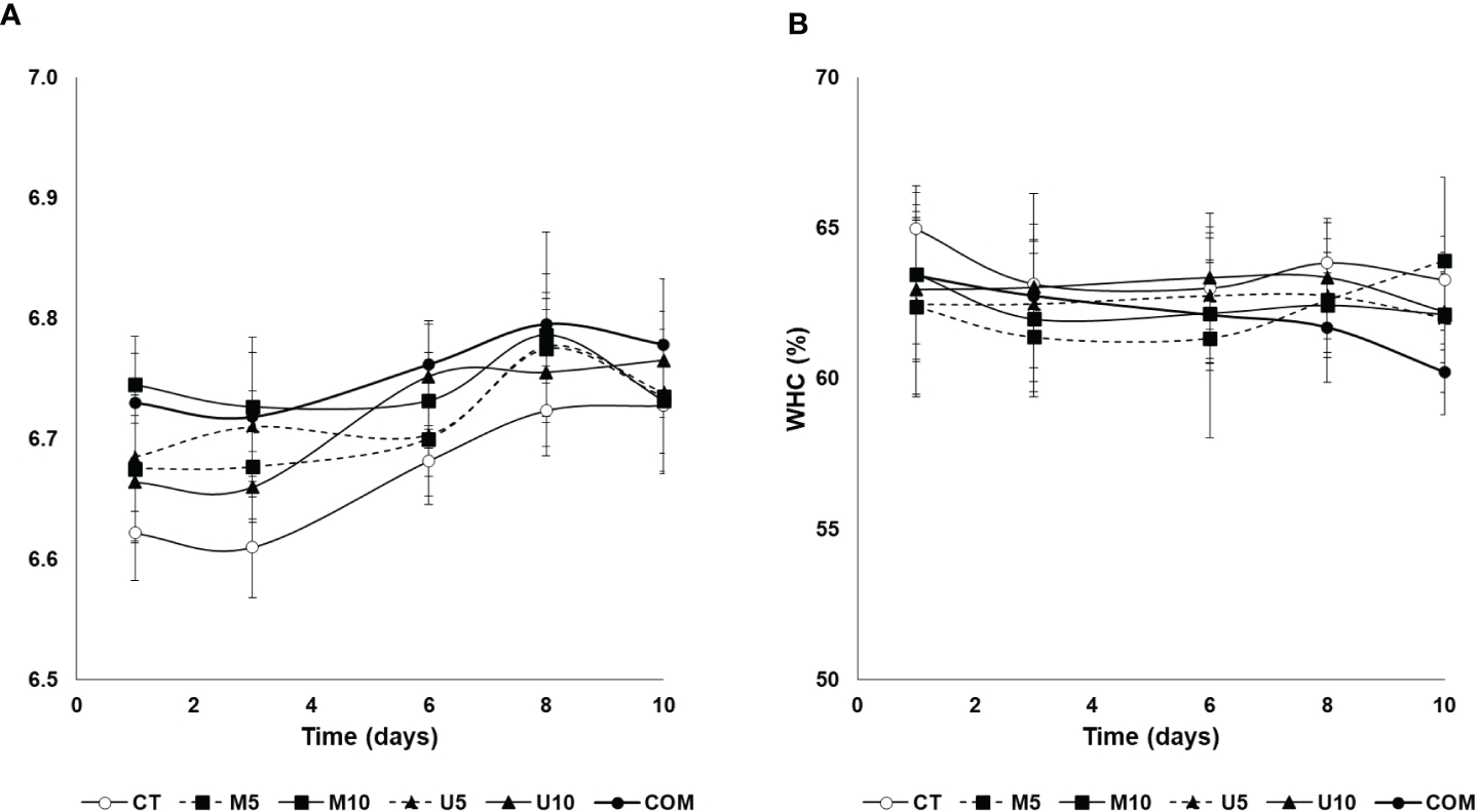 Flesh pH was determined in the dorsal muscle by means of a penetration electrode (Crison, model GLP 21; sensitivity 0.01 pH units) as described in Suárez et al. (2010). The water-holding capacity (WHC; expressed in percentage) was calculated from the small cubes (1 cm3) of the anterior part of the dorsal muscle as the difference between the initial percentage of water and the percentage of water released after centrifugation, as detailed in Suárez et al. (2010).