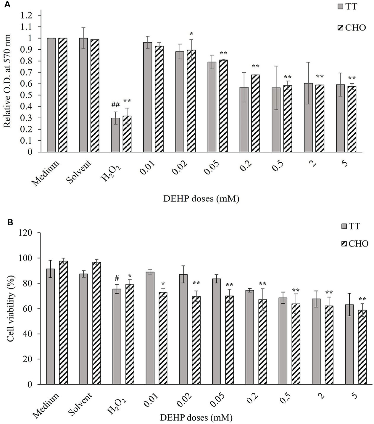 Cellular viability in DEHP-exposed TT and CHO cell lines. (A) MTT assay results are displayed as a mean of the optical density (OD) at 570 nm, at each treatment level normalized to the relative solvent (DMSO) in each cell line. Data are expressed as mean ± SD of two independent experiments. (B) Trypan Blue exclusion assay results are expressed as the percentage of viable cells out of the total cells at each treatment level. Data are expressed as mean ± SD of two independent experiments. One-way ANOVA significance: #p ≤ 0.05 H2O2 vs medium in TT cell line; ##p ≤ 0.01 H2O2 vs medium in TT cell line; *p ≤ 0.05 H2O2 vs medium and treated vs solvent in CHO cell line; **p ≤ 0.01 H2O2 vs medium and treated vs solvent in CHO cell line. DEHP, di(2-ethylhexyl)phthalate; TT, Tursiops truncatus; CHO, Chinese hamster ovary; DMSO, dimethyl sulfoxide.