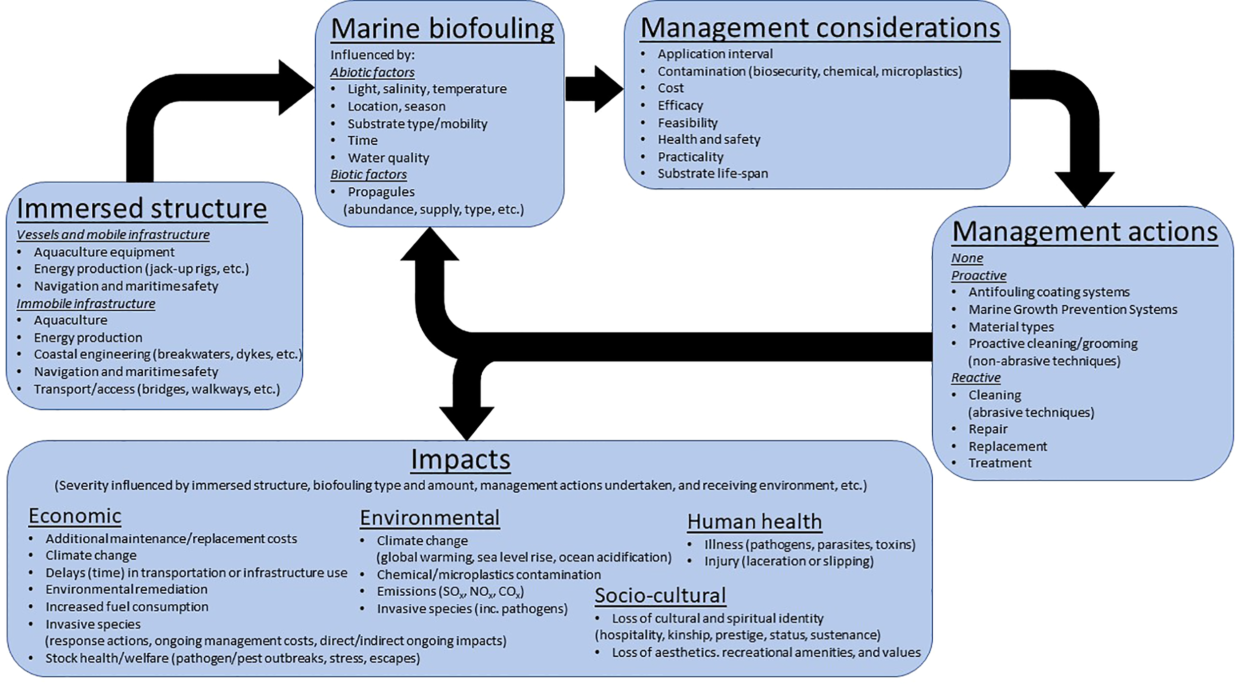 Influences, management considerations, and impacts of marine biofouling on immersed structures.