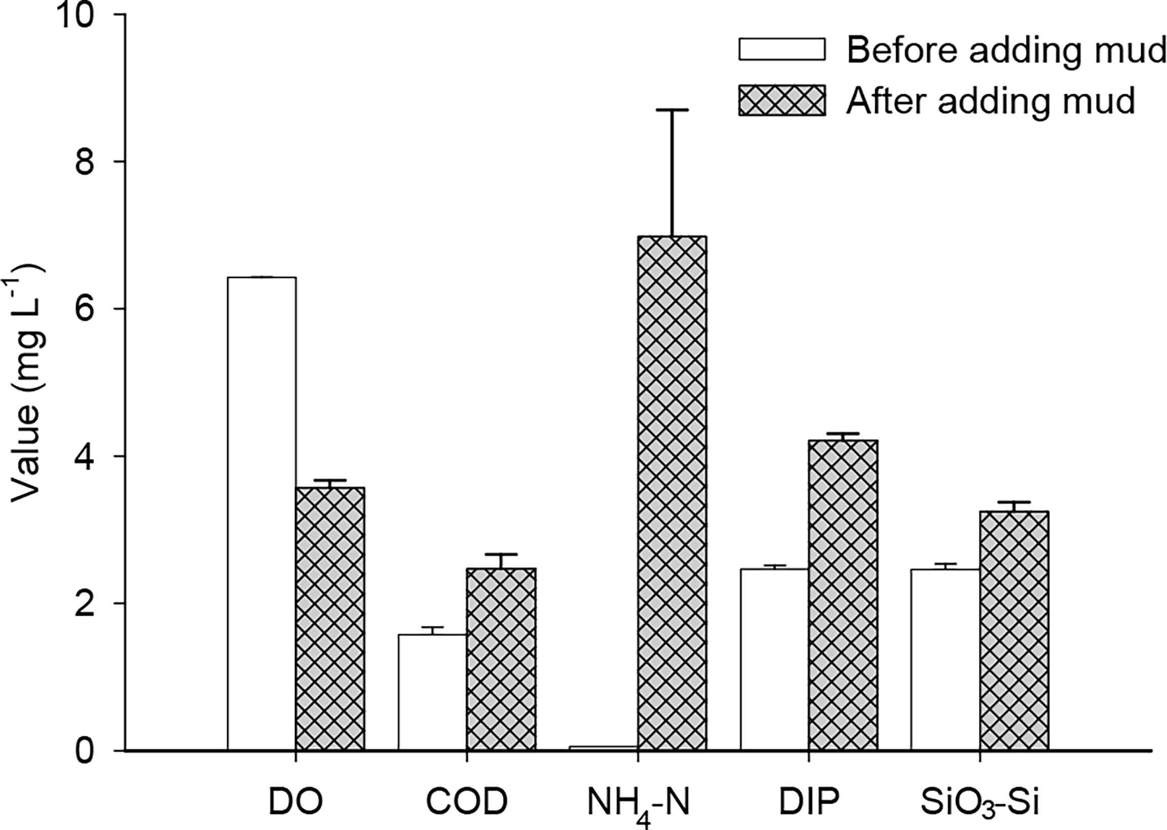 DO, COD, NH4-N, DIP, and SiO3-Si values before and after adding sediment into Mesocosm B (mean ± SD, NH4-N × 50, and DIP × 100).