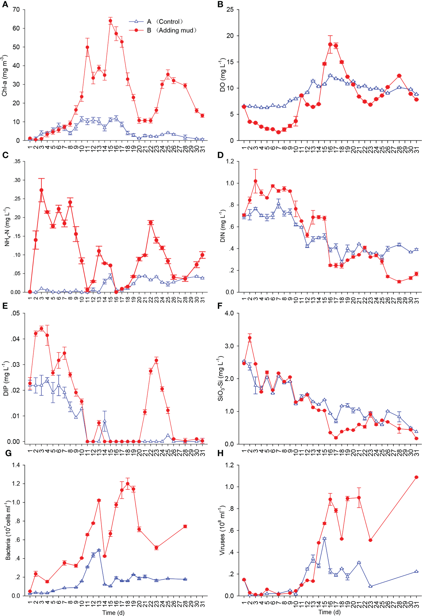 Concentrations of Chl-a (A), DO (B), NH4-N (C), DIN (D), DIP (E), and SiO3-Si (F) and abundances of bacteria (G) and viruses (H) during the experiment (Mean ± SD).
