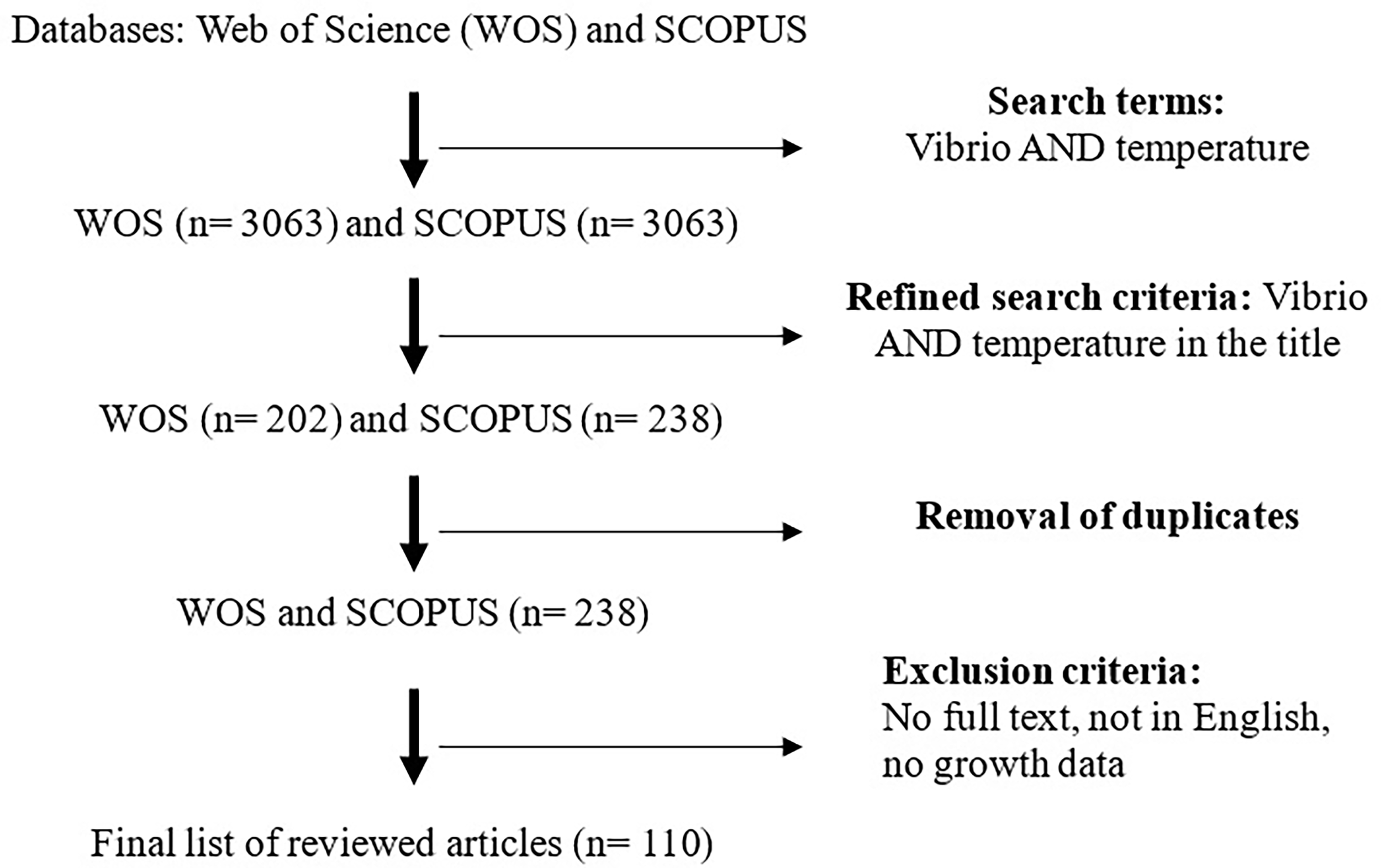 A systematic literature search was conducted using Web of Science (WoS) and SCOPUS databases up to 1st January 2022. The search was limited to these 2 databases due to the quality of these databases and the abundance of literature on the subject. The keywords used were “Vibrio AND temperature”. A total of 3063 and 3542 documents were retrieved from WoS and SCOPUS databases, respectively. The search was then limited to the article search keyword appearing in the title which yielded a search term of “TITLE (vibrio AND temperature)”. A total of 202 and 238 articles were retrieved from WOS and SCOPUS databases respectively which were then subjected to further screening. These 2 search results were combined (202 + 238) resulting in 440 articles which were then subjected to screening.