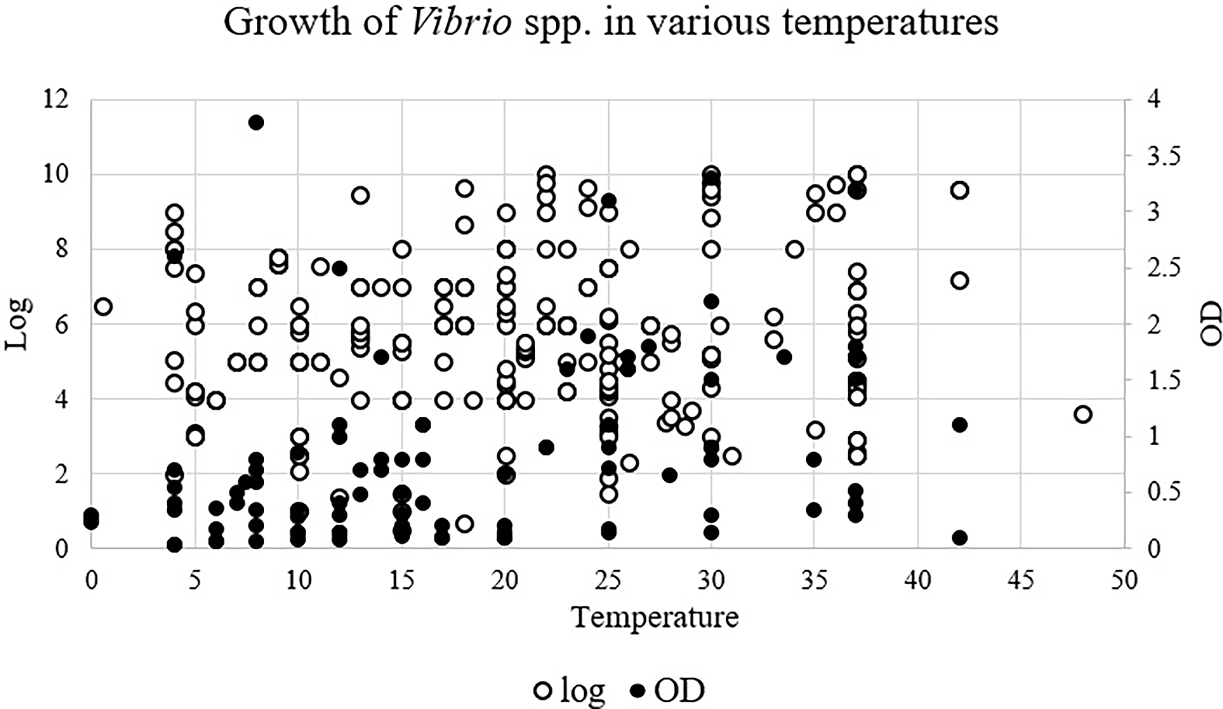 Growth of Vibrio spp. in various temperatures. Log, Log growth; OD, Optical density.