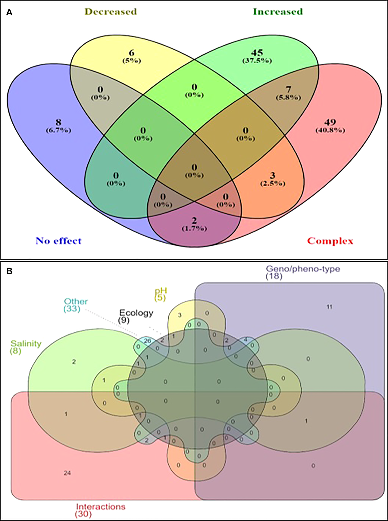 Venn Diagram illustrating the effect of temperature on Vibrio spp. (A) Effect of temperature on upshift on the growth of Vibrio spp. (B) Multifactorial parameters affecting the growth of Vibrio spp. under elevated temperatures.