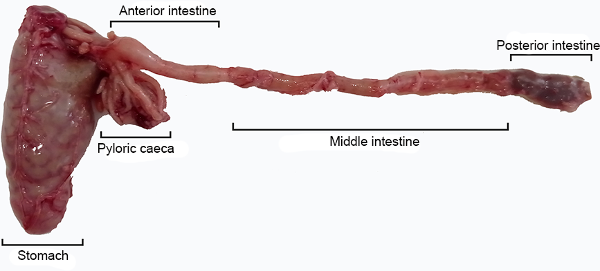 Digestive tract of a Seriola dumerili juvenile indicating the dissected regions for digestive enzymes analysis.