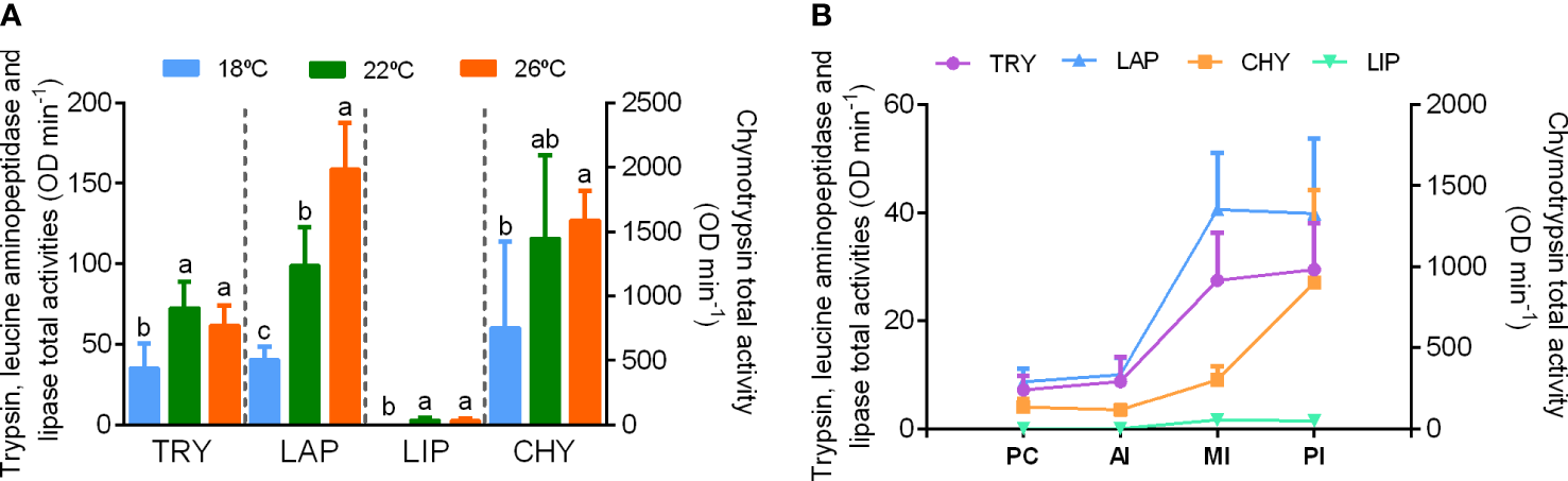 (A) Total activity of digestive enzymes in the intestinal tract of Seriola dumerili juveniles reared at 18 (blue), 22 (green) and 26°C (orange). (B) Total activity of digestive enzymes present in the gut sections of Seriola dumerili reared at 22°C. PC – pyloric caeca, AI – anterior intestine, MI – middle intestine, PI – posterior intestine. Chymotrypsin activity is represented in the right Y axis. TRY, trypsin; CHY, chymotrypsin; LAP, leucine aminopeptidase; LIP, lipase. Data is presented as means ± SD (n = 8). Different letters indicate significant differences for each enzyme among rearing temperatures (P< 0.05).