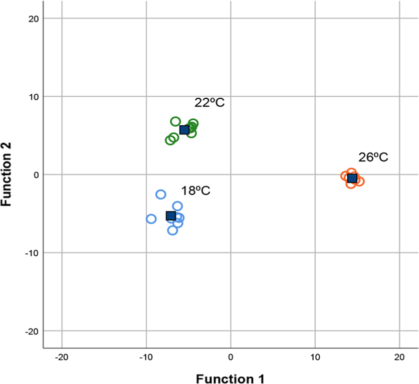 Plot of the two axes from the forward stepwise discriminant function analysis of digestive enzymes total activities in Seriola dumerili juveniles reared at 18 (blue), 22 (green) and 26°C (orange). Group centroids are represented by blue squares.