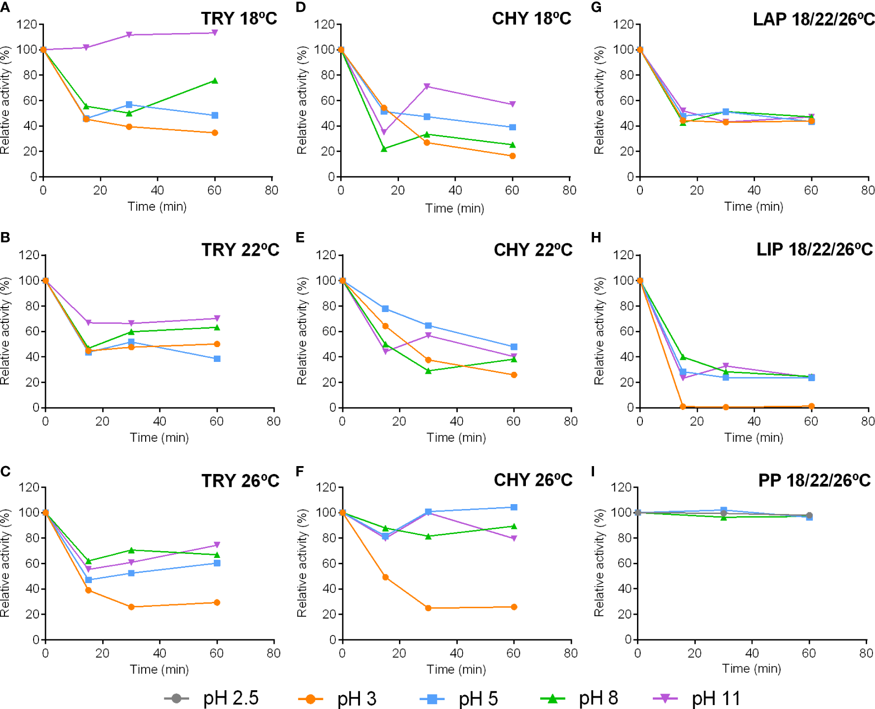 Stability of trypsin (TRY), chymotrypsin (CHY), leucine aminopeptidase (LAP), lipase (LIP) and pepsin (PP) activities from pyloric caeca and stomach of S. dumerili incubated at different pH. Leucine aminopeptidase, lipase and pepsin graphs represent mean values from all treatments. Individual graphs of pH stability for each enzyme in extracts coming from the different rearing temperatures are shown in the Supplementary Figure 1.