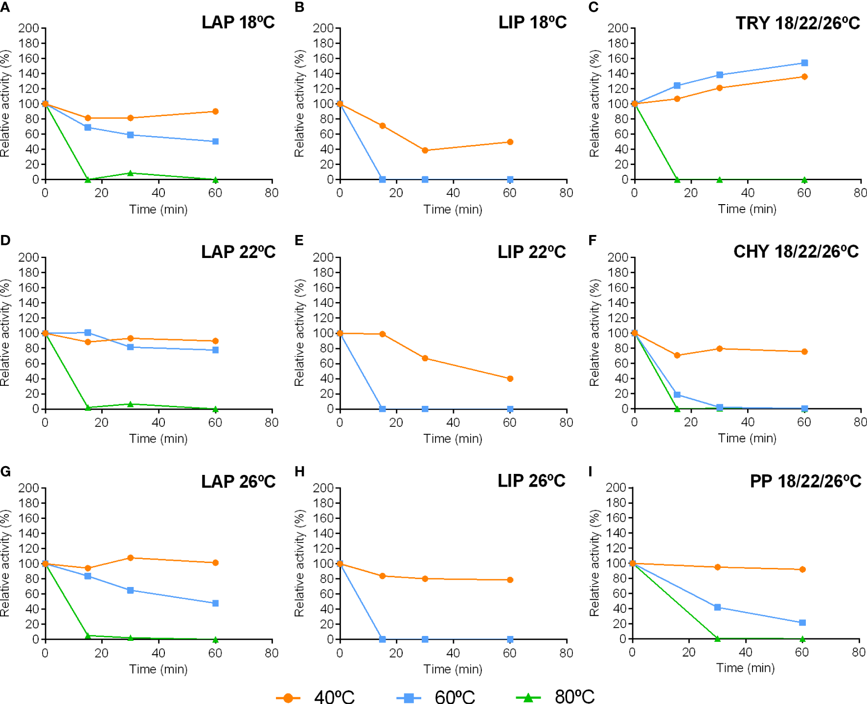 Differences were evident in the thermal stability of studied enzymes (Figure 5). The most stable enzyme was trypsin, whose activity was stable up to 60°C for at least 1 h (Figure 5G). The next more stable enzyme was leucine aminopeptidase, which was fairly stable at 40°C for 1 h and kept more than 50% of activity after this period at 60°C (Figures 5A-C). Pepsin was also stable at 40°C for 1 h, although its activity decreased more than 50% after 30 min at 60°C (Figure 5I). Conversely, chymotrypsin activity was thermally sensitive, losing 20% of activity at 40°C and more than 80% of activity at 60°C after just 15 min (Figure 5H). However, the most thermally sensitive enzyme was lipase; 60°C was able to completely abrogate activity after just 15 min (Figures 5D–F).