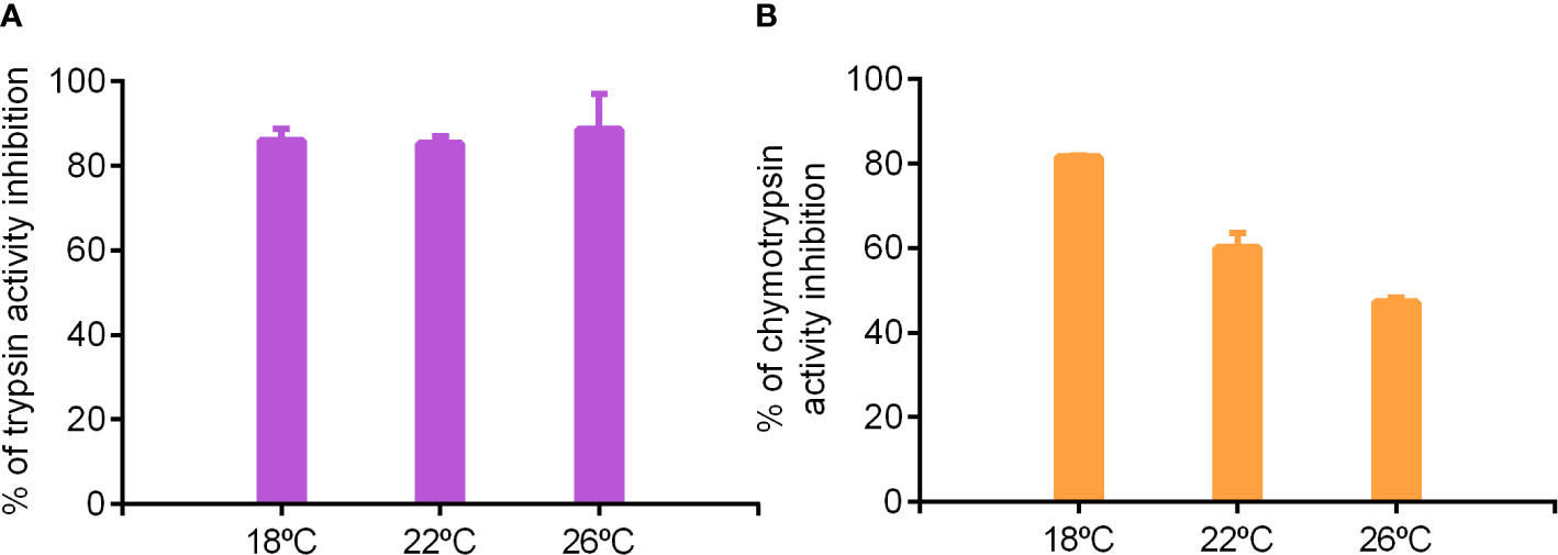 Total enzyme secretion was assessed by performing the analyses at the optimal pH for each enzyme and 37°C. Chymotrypsin was the most abundant enzyme and lipase the enzyme with the lowest activity (Figure 2A). Significant differences in total activity levels were found for all enzymes among the rearing temperatures, with fish reared at 22 and 26°C showing higher activity levels than at 18°C for all intestinal enzymes except for chymotrypsin, for which activity levels were only statistically different between fish reared at 26 and 18°C (Figure 2A). Total pepsin activity levels were higher in fish reared at 22 and 26°C than at 18°C (Supplementary Table 1). Under real conditions of temperature (18, 22 or 26°C) and physiological pH, the general activity pattern in pyloric caeca was similar but activity levels much lower (Supplementary Table 1). This was particularly noticeable for pepsin and lipase. Lipase activity was undetectable in extracts from fish reared at 22 and 18°C, and pepsin activity was not detected in any extract, independently of rearing temperature (Supplementary Table 1).