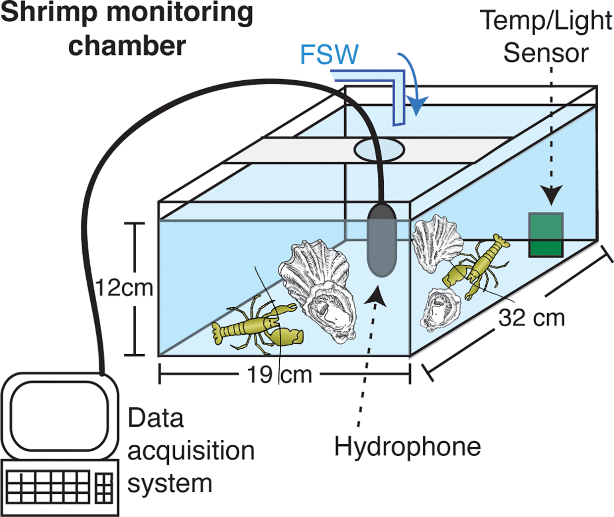 Experimental chamber set-up for acoustic monitoring of snapping shrimp under different temperature treatments. Schematic shows example of tank used in Experiments 1, which was slightly modified for Experiment 2 to use a recirculating water bath rather than flow-through to achieve desired temperatures. Experiment 3 was conducted with the same data acquisition and overall set-up but in larger seawater tables to accommodate 10 shrimp and sheltering habitat. Sample sizes, treatments, and groupings for each experiment appear in Table 1.
