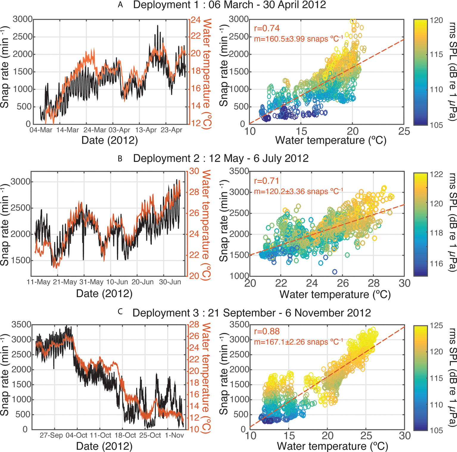 Time series and correlations of snap rates and water temperatures for 2012 deployment periods (A) 1, (B) 2, and (C) 3. Correlation plots show snap rate vs. water temperature with color indicating the measured root-mean-square sound pressure levels for each sample. Red lines are least squares fits to the data, and the correlation coefficients and slopes are displayed on each panel.